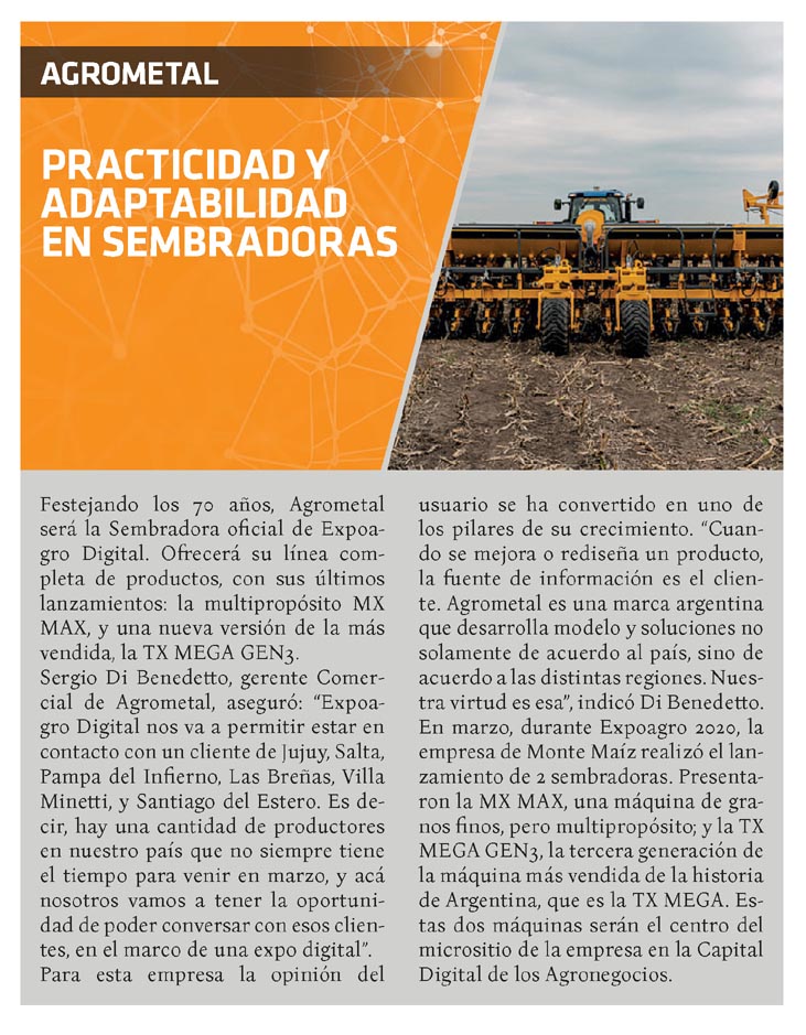 Festejando los 70 años, Agrometal será la Sembradora oficial de Expoagro Digital. Ofrecerá su línea completa de productos, con sus últimos lanzamientos: la multipropósito MX MAX, y una nueva versión de la más vendida, la TX MEGA GEN3. Sergio Di Benedetto, gerente Comercial de Agrometal, aseguró: «Expoagro Digital nos va a permitir estar en contacto con un cliente de Jujuy, Salta, Pampa del Infierno, Las Breñas, Villa Minetti, y Santiago del Estero. Es decir, hay una cantidad de productores en nuestro país que no siempre tiene el tiempo para venir en marzo, y acá nosotros vamos a tener la oportunidad de poder conversar con esos clientes, en el marco de una expo digital”. Para esta empresa la opinión del usuario se ha convertido en uno de los pilares de su crecimiento. «Cuando se mejora o rediseña un producto, la foente de información es el cliente. Agrometal es una marca argentina que desarrolla modelo y soluciones no solamente de acuerdo al país, sino de acuerdo a las distintas regiones. Nuestra virtud es esa”, indicó Di Benedetto. En marzo, durante Expoagro 2020, la empresa de Monte Maíz realizó el lanzamiento de 2 sembradoras. Presentaron la MX MAX, una máquina de granos finos, pero multipropósito; y la TX MEGA GEN3, la tercera generación de la máquina más vendida de la historia de Argentina, que es la TX MEGA. Estas dos máquinas serán el centro del micrositio de la empresa en la Capital Digital de los Agronegocios.