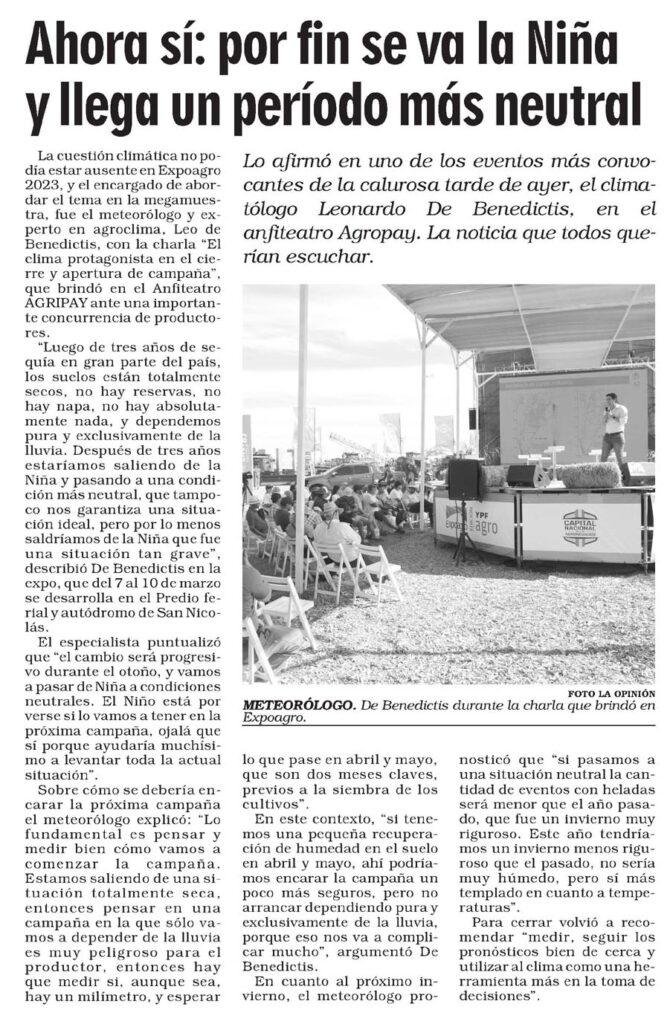 «Luego de tres años de sequía en gran parte del país, los suelos están totalmente secos, no hay reservas, no hay napa, no hay absolutamente nada, y dependemos pura y exclusivamente de la lluvia. Después de tres años estaríamos saliendo de la Niña y pasando a una condición más neutral, que tampoco nos garantiza una situación ideal, pero por lo menos saldríamos de la Niña que fue una situación tan grave», describió De Benedictis en la expo, que del 7al 10 de marzo se desarrolla en el Predio feríal y autódromo de San Nicolás.