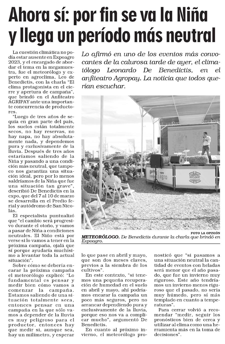 La cuestión climática no podía estar ausente en Expoagro 2023, y el encargado de abordar el tema en la megamuestra, fue el meteorólogo y experto en agroclima, Leo de Benedictis, con la charla «El clima protagonista en el cierre y apertura de campaña», que brindó en el Anfiteatro AGRIPAY ante una importante concurrencia de productores.