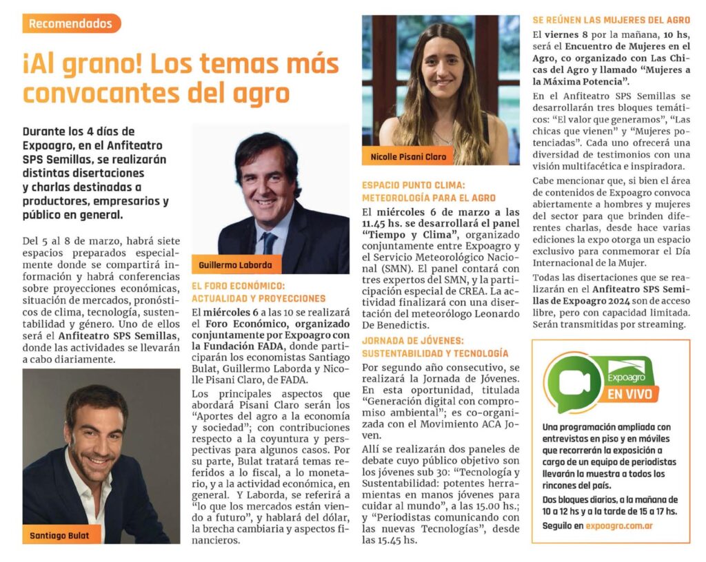 Durante los 4 días de Expoagro, en el Anfiteatro SPS Semillas, se realizarán distintas disertaciones y charlas destinadas a productores, empresarios y público en general.Del 5 al 8 de marzo, habrá siete espacios preparados especialmente donde se compartirá información y habrá conferencias sobre proyecciones económicas, situación de mercados, pronósticos de clima, tecnología, sustentabilidad y género. Uno de ellos será el Anfiteatro SPS Semillas, donde las actividades se llevarán a cabo diariamente.Santiago Bulat EL FORO ECONÓMICO: ACTUALIDAD Y PROYECCIONES El miércoles 6 a las 10 se realizará el Foro Económico, organizado conjuntamente por Expoagro con la Fundación FADA, donde participarán los economistas Santiago Bulat, Guillermo Laborda y Nicolle Pisani Claro, de FADA.Los principales aspectos que abordará Pisani Claro serán los «Aportes del agro a la economía y sociedad»; con contribuciones respecto a la coyuntura y perspectivas para algunos casos. Por su parte, Bulat tratará temas referidos a lo fiscal, a lo monetario, y a la actividad económica, en general. Y Laborda, se referirá a «lo que los mercados están viendo a futuro», y hablará del dólar, la brecha cambiaría y aspectos financieros.ESPACIO PUNTO CLIMA: METEOROLOGÍA PARA EL AGRO El miércoles 6 de marzo a las 11.45 hs. se desarrollará el panel «Tiempo y Clima», organizado conjuntamente entre Expoagro y el Servicio Meteorológico Nacional (SMN). El panel contará con tres expertos del SMN, y la participación especial de CREA. La actividad finalizará con una disertación del meteorólogo Leonardo De Benedictis.JORNADA DE JÓVENES: SUSTENTABILIDAD Y TECNOLOGÍA Por segundo año consecutivo, se realizará la Jornada de Jóvenes. En esta oportunidad, titulada «Generación digital con compromiso ambiental»; es co-organizada con el Movimiento ACA Joven.Allí se realizarán dos paneles de debate cuyo público objetivo son los jóvenes sub 30: «Tecnología y Sustentabilidad: potentes herramientas en manos jóvenes para cuidar al mundo», a las 15.00 hs.; y «Periodistas comunicando con las nuevas Tecnologías», desde las 15.45 hs.SE REÚNEN LAS MUJERES DEL AGRO El viernes 8 por la mañana, 10 hs, será el Encuentro de Mujeres en el Agro, co organizado con Las Chicas del Agro y llamado «Mujeres a la Máxima Potencia».En el Anfiteatro SPS Semillas se desarrollarán tres bloques temáticos: «El valor que generamos», «Las chicas que vienen» y «Mujeres potenciadas». Cada uno ofrecerá una diversidad de testimonios con una visión multifacética e inspiradora.Cabe mencionar que, si bien el área de contenidos de Expoagro convoca abiertamente a hombres y mujeres del sector para que brinden diferentes charlas, desde hace varias ediciones la expo otorga un espacio exclusivo para conmemorar el Día Internacional de la Mujer.Todas las disertaciones que se realizarán en el Anfiteatro SPS Semillas de Expoagro 2024 son de acceso libre, pero con capacidad limitada. Serán transmitidas por streaming.