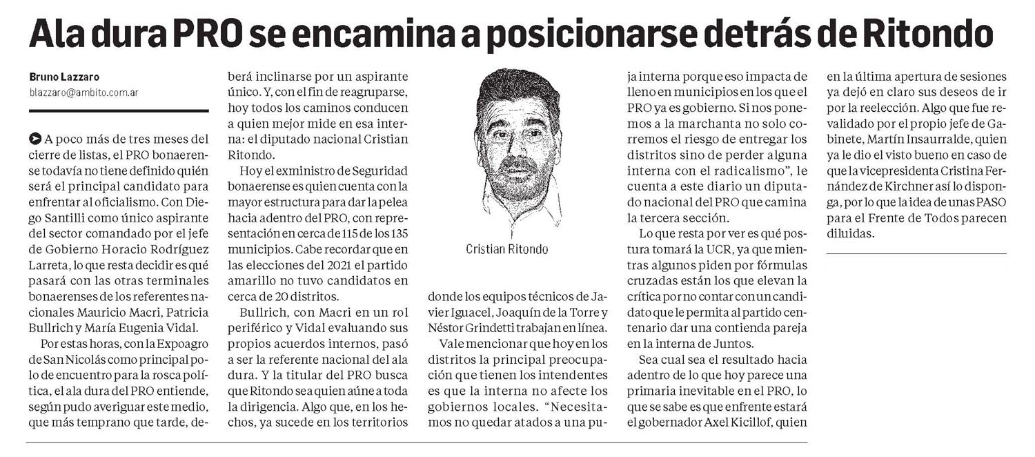 Por estas horas, con la Expoagro de San Nicolás como principal polo de encuentro para la rosca política, el ala dura del PRO entiende, según pudo averiguar este medio, que más temprano que tarde, deberá inclinarse por un aspirante único. Y, con el fin de reagruparse, hoy todos los caminos conducen a quien mejor mide en esa interna: el diputado nacional Cristian Ritondo.