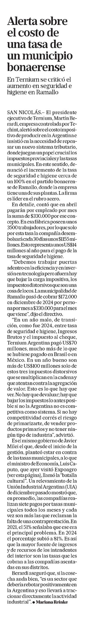 SAN NICOLÁS.? El presidente ejecutivo de Ternium, Martín Berardi, empresa controlada por Techint, alertó sobre el costo impositivo de producir en la Argentina e insistió en la necesidad de repensar un nuevo sistema tributario, donde juegan un papel crucial los impuestos provinciales y las tasas municipales. En este sentido, denunció el incremento de la tasa de seguridad e higiene cerca de un 100% en el partido bonaerense de Ramallo, donde la empresa tiene una de sus plantas. La firma es líder en el rubro acero.