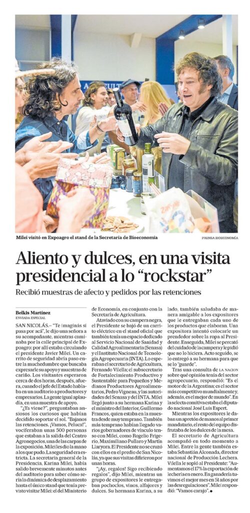 Recibió muestras de afecto y pedidos por las retencionesMilei visitó en Expoagro el stand de la Secretaría de BioeconomíaSAN NICOLÁS.- «Te imaginás si pasa por acá», le dijo una señora a su acompañante, mientras caminaba por la calle principal de Expoagro: por allí estaba circulando el presidente Javier Milei. Un carrito de seguridad abría paso entre la muchedumbre que buscaba expresarle su apoyo y muestras de cariño. Los visitantes esperaron cerca de dos horas, después, afuera, cuando el jefe del Estado hablaba en un auditorio a productores y empresarios. La gente igual aplaudía, en una muestra de apoyo.»¿Ya viene?», preguntaban ansiosos los curiosos que habían decidido soportar el sol. «Bajanos las retenciones. ¡Vamos, Peluca!», vociferaban unas 500 personas que estaban a la salida del Centro Agronegocios, una de las carpas de la exposición. Milei les dio la mano a los que pudo. La seguridad era estricta. La secretaria general de la Presidencia, Karina Milei, había salido brevemente minutos antes del auditorio para saber cómo sería la dinámica de desplazamiento hasta el único stand que tenía previsto visitar Milei: el del Ministerio de Economía, en conjunto con la Secretaría de Agricultura.Ataviado con su campera negra, el Presidente se bajó de un carrito eléctrico en el stand oficial que también tenía un espacio dedicado al Servicio Nacional de Sanidad y Calidad Agroalimentaria (Senasa) y el Instituto Nacional de Tecnología Agropecuaria (INTA). Lo esperaban el secretario de Agricultura, Fernando Vilella; el subsecretario de Fortalecimiento Productivo y Sustentable para Pequeños y Medianos Productores Agroalimentarios, Pedro Vigneau, y las autoridades del Senasa y del INTA. Milei llegó junto a su hermana Karina y el ministro del Interior, Guillermo Francos, quien estaba en la muestra desde muy temprano. También más temprano habían llegado varios gobernadores de vínculo tenso con Milei, como Rogelio Frigerio, Maximiliano Pullaro y Martín Llaryora. El Presidente no se cruzó con ellos en el predio de San Nicolás, ya que sus visitas difirieron por unas horas.»¡Ay, regalos! Sigo recibiendo regalos», dijo Milei, mientras un grupo de expositores le entregaban pochoclos, vinos, alfajores y dulces. Su hermana Karina, a su lado, también saludaba de manera amigable a los expositores que le entregaban cada uno de los productos que elaboran. Una expositora intentó colocarle un prendedor sobre la ropa al Presidente. Enseguida, Milei se percató del cuidado de la campera y le pidió que no lo hiciera. Acto seguido, se lo entregó a su hermana para que se lo «guarde».Tras una consulta de la nación sobre qué opinión tenía del sector agropecuario, respondió: «Es el motor de la Argentina; es el sector más competitivo mundialmente y, además, es el mejor de mundo». En la selecta comitiva estaba el diputado nacional José Luis Espert.Mientras los expositores le daban un apretón de manos al primer mandatario, el resto del equipo disfrutaba de los dulces de la mesa.El secretario de Agricultura acompañó en todo momento a Milei. Entre la gente también estaba Sebastián Alconada, director nacional de Producción Lechera. Vilella le sopló al Presidente: «Aumentamos el 17% la exportación de lechería en enero. En ganadería tuvimos el mejor mes en 51 años por las desregulaciones». Milei respondió: «Vamos carajo»