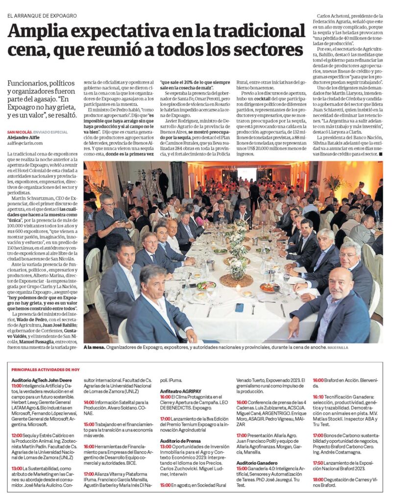 Ante la variada presencia de funcionarios, políticos , empresarios y productores, Alberto Marina, director de Exponenciar -la empresa integrada por Grupo Clarín y La Nación, que organiza Expoagro-, aseguró que «hoy podemos decir que en Expoagro no hay grieta, y eso es un valor que hemos construido entre todos».
