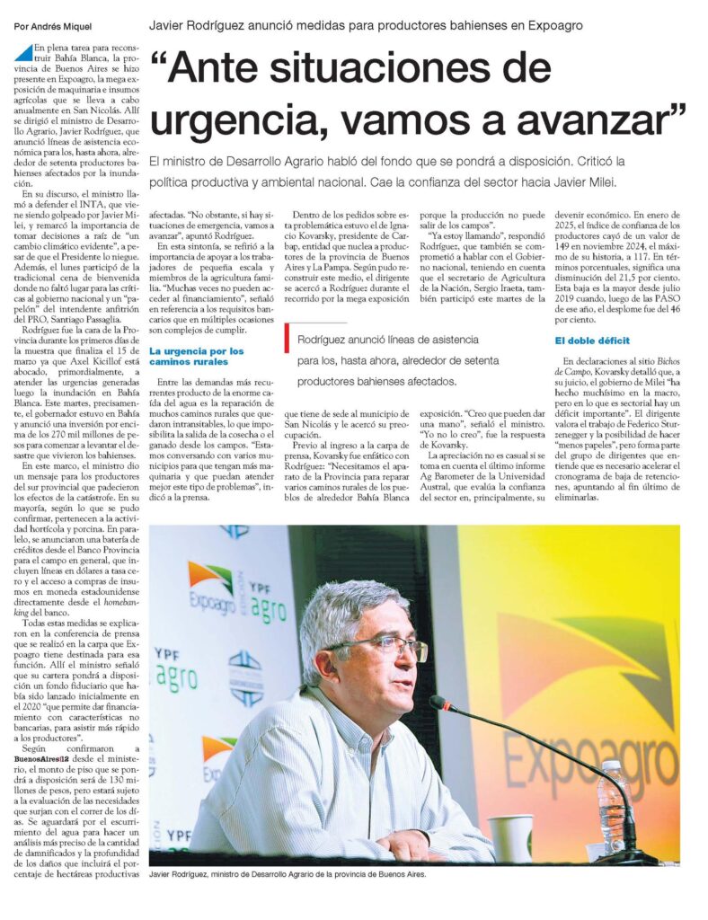 @En plena tarea para reconstruir Bahía Blanca, la provincia de Buenos Aires se hizo presente en Expoagro, la mega exposición de maquinaria e insumos agrícolas que se lleva a cabo anualmente en San Nicolás. Allí se dirigió el ministro de Desarrollo Agrario, Javier Rodríguez, que anunció líneas de asistencia económica para los, hasta ahora, alrededor de setenta productores bahienses afectados por la inundación.
