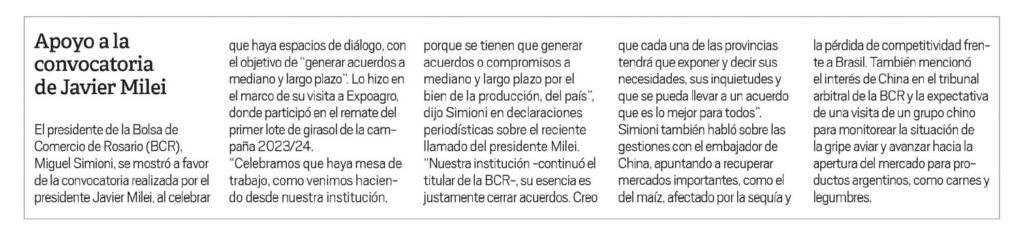 El presidente de la Bolsa de Comercio de Rosario (BCR), Miguel Simioni, se mostró a favor de la convocatoria realizada por el presidente Javier Milei, al celebraue haya espacios de diálogo, con el objetivo de “generar acuerdos a mediano y largo plazo”. Lo hizo en el marco de su visita a Expoagro, donde participó en el remate del primer lote de girasol de la campaña 2023/24.“Celebramos que haya mesa de trabajo, como venimos haciendo desde nuestra institución,porque se tienen que generar acuerdos o compromisos a mediano y largo plazo por el bien de la producción, del país”, dijo Simioni en declaraciones periodísticas sobre el reciente llamado del presidente Milei. “Nuestra institución -continuó el titular de la BCR-, su esencia es justamente cerrar acuerdos, Creue cada una de las provincias tendrá que exponer y decir sus necesidades, sus inquietudes y que se pueda llevar a un acuerdo que es lo mejor para todos”. Simionitambién habló sobre las gestiones con el embajador de China, apuntando a recuperar mercados importantes, como el del maíz, afectado por la sequía a pérdida de competitividad frentea Brasil. También mencionóel interés de China en el tribunal arbitral de la BCR y la expectativa de una visita de un grupo chino para monitorear la situación da gripe aviar y avanzar hacia la apertura del mercado para productos argentinos, como carnes y legumbres.