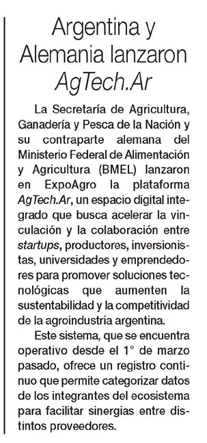 La Secretaría de Agricultura, Ganadería y Pesca de la Nación y su contraparte alemana del Ministerio Federal de Alimentación y Agricultura (BMEL) lanzaron en ExpoAgro la plataforma AgTech.Ar, un espacio digital integrado que busca acelerar la vinculación y la colaboración entre startups, productores, inversionistas, universidades y emprendedores para promover soluciones tecnológicas que aumenten la sustentabilidad y la competitividad de la agroindustria argentina.