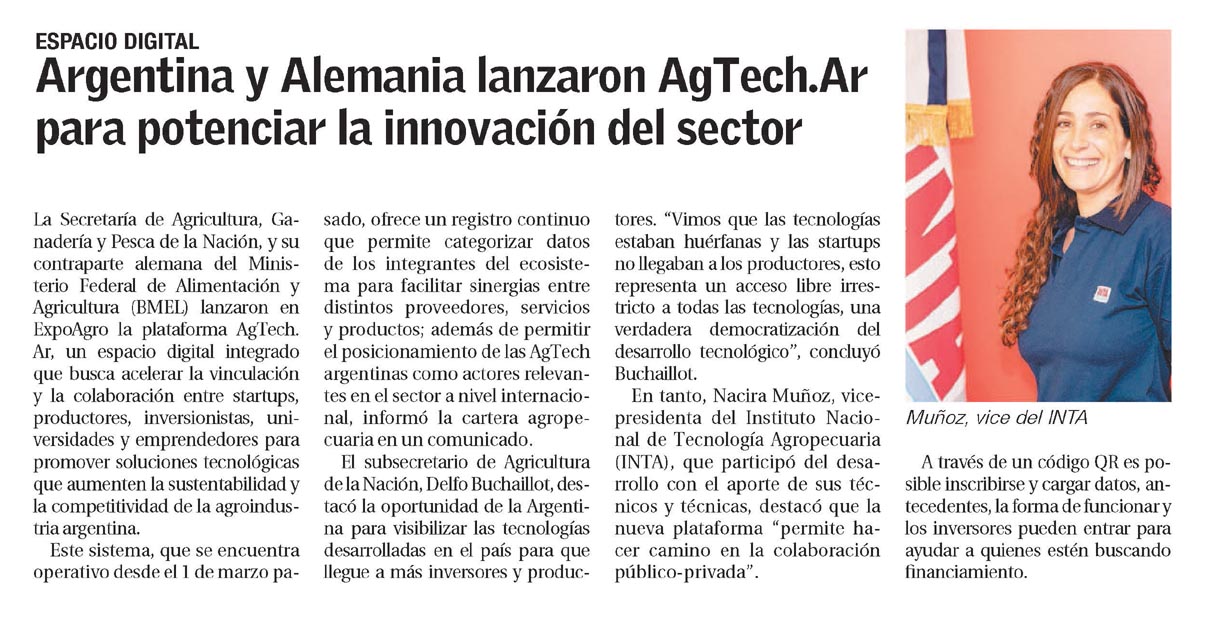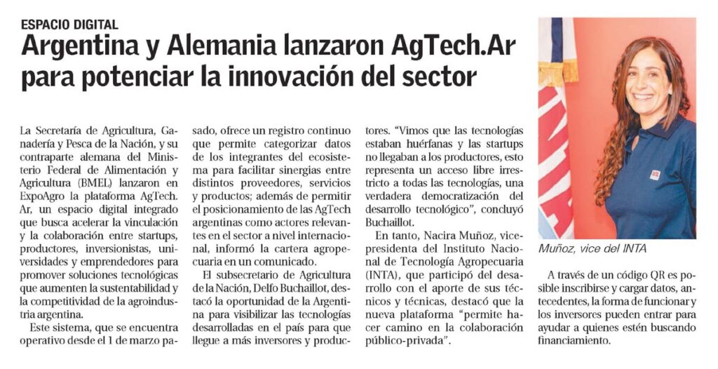 La Secretaría de Agricultura, Ganadería y Pesca de la Nación, y su contraparte alemana del Ministerio Federal de Alimentación y Agricultura (BMEL) lanzaron en ExpoAgro la plataforma AgTech.