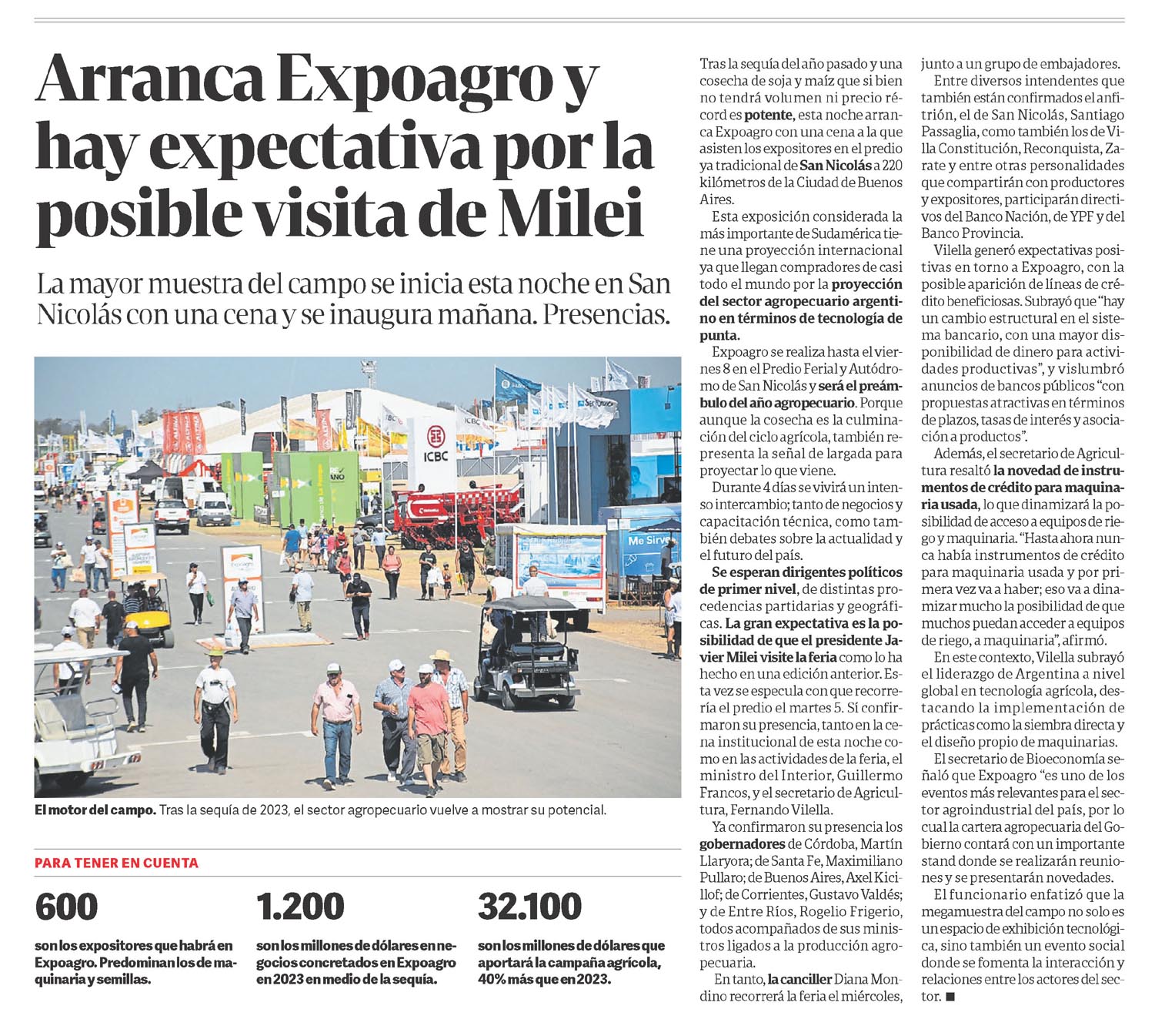 La mayor muestra del campo se inicia esta noche en San Nicolás con una cena y se inaugura mañana. Presencias.Tras la sequía del año pasado y una cosecha de soja y maíz que si bien no tendrá volumen ni precio récord es potente, esta noche arranca Expoagro con una cena a la que asisten los expositores en el predio ya tradicional de San Nicolás a 220 kilómetros de la Ciudad de Buenos Aires.Esta exposición considerada la más importante de Sudamérica tiene una proyección internacional ya que llegan compradores de casi todo el mundo por la proyección del sector agropecuario argentino en términos de tecnología de punta.Expoagro se realiza hasta el viernes 8 en el Predio Ferial y Autódromo de San Nicolás y será el preámbulo del año agropecuario. Porque aunque la cosecha es la culminación del ciclo agrícola, también representa la señal de largada para proyectar lo que viene.Durante 4 días se vivirá un intenso intercambio; tanto de negocios y capacitación técnica, como también debates sobre la actualidad y el futuro del país.Se esperan dirigentes políticos de primer nivel, de distintas procedencias partidarias y geográficas.La gran expectativa es la posibilidad de que el presidente Javier Milei visite la feria como lo ha hecho en una edición anterior. Esta vez se especula con que recorrería el predio el martes 5. Sí confirmaron su presencia, tanto en la cena institucional de esta noche como en las actividades de la feria, el ministro del Interior, Guillermo Francos, y el secretario de Agricultura, Fernando Vilella.Ya confirmaron su presencia los gobernadores de Córdoba, Martín Llaryora; de Santa Fe, Maximiliano Pullaro; de Buenos Aires, Axel Kicillof; de Corrientes, Gustavo Valdés; y de Entre Ríos, Rogelio Frigerio, todos acompañados de sus ministros ligados a la producción agropecuaria.En tanto, la canciller Diana Mondino recorrerá la feria el miércoles, abajunto a un grupo de embajadores.Entre diversos intendentes que también están confirmados el anfitrión, el de San Nicolás, Santiago Passaglia, como también los de Villa Constitución, Reconquista, Zarate y entre otras personalidades que compartirán con productores y expositores, participarán directivos del Banco Nación, de YPF y del Banco Provincia.Vilella generó expectativas positivas en torno a Expoagro, con la posible aparición de líneas de crédito beneficiosas. Subrayó que «hay un cambio estructural en el sistema bancario, con una mayor disponibilidad de dinero para actividades productivas», y vislumbró anuncios de bancos públicos «con propuestas atractivas en términos de plazos, tasas de interés y asociación a productos».Además, el secretario de Agricultura resaltó la novedad de instrumentos de crédito para maquinaria usada, lo que dinamizará la posibilidad de acceso a equipos de riego y maquinaria. «Hasta ahora nunca había instrumentos de crédito para maquinaria usada y por primera vez va a haber; eso va a dinamizar mucho la posibilidad de que muchos puedan acceder a equipos de riego, a maquinaria», afirmó.En este contexto, Vilella subrayó el liderazgo de Argentina a nivel global en tecnología agrícola, destacando la implementación de prácticas como la siembra directa y el diseño propio de maquinarias.El secretario de Bioeconomía señaló que Expoagro «es uno de los eventos más relevantes para el sector agroindustrial del país, por lo cual la cartera agropecuaria del Gobierno contará con un importante stand donde se realizarán reuniones y se presentarán novedades.El funcionario enfatizó que la megamuestra del campo no solo es un espacio de exhibición tecnológica, sino también un evento social donde se fomenta la interacción y relaciones entre los actores del sector.El motor del campo. Tras la sequía de 2023, el sector agropecuario vuelve a mostrar su potencial.PARA TENER EN CUENTA600son los expositores que habrá en Expoagro. Predominan los de maquinaria y semillas.1.200son los millones de dólares en negocios concretados en Expoagro en 2023 en medio de la sequía.32.100son los millones de dólares que aportará la campaña agrícola, 40% más que en 2023.