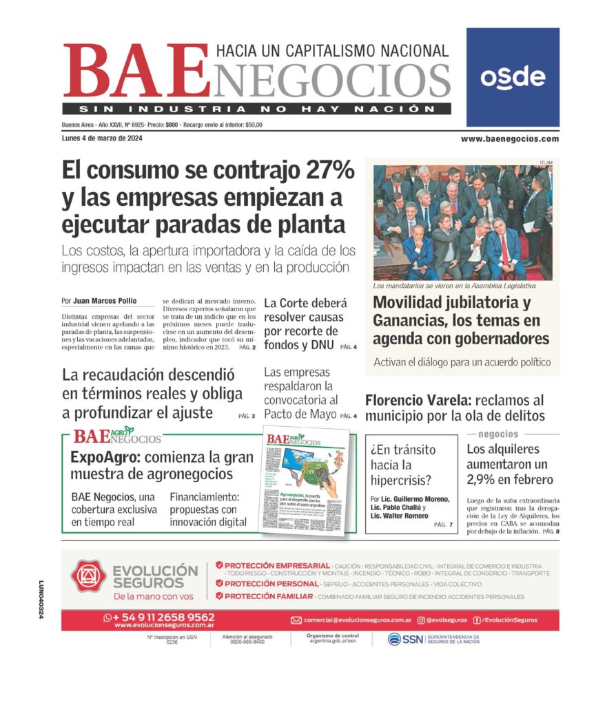 El consumo se contrajo 27% y las empresas empiezan a ejecutar paradas de planta Los costos, la apertura importadora y la caída de los ingresos impactan en las ventas y en la producción Por Juan Marcos Pollio Distintas empresas del sector industrial vienen apelando a las paradas de planta, las suspensiones y las vacaciones adelantadas, especialmente en las ramas que se dedican al mercado interno.Diversos expertos señalaron que se trata de un indicio que en los próximos meses puede traducirse en un aumento del desempleo, indicador que tocó su mínimo histórico en 2023. pág. 2La Corte deberá resolver causas por recorte de fondos y DNU pág. 4La recaudación descendió en términos reales y obliga a profundizar el ajuste pág. 3Las empresas respaldaron la convocatoria al Pacto de Mayo pág. 4Movilidad jubilatoria y Ganancias, los temas en agenda con gobernadores Activan el diálogo para un acuerdo político Los mandatarios se vieron en la Asamblea LegislativaFlorencio Varela: reclamos al municipio por la ola de delitosExpoAgro: comienza la gran muestra de agronegocios BAE Negocios, una cobertura exclusiva en tiempo real Financiamiento: propuestas con innovación digital¿En tránsito hacia la hipercrisis? Por Lic. Guillermo Moreno, Lic. Pablo Challú y Lic. Walter Romero Pág. 7Negocios Los alquileres aumentaron un 2,9% en febrero Luego de la suba extraordinaria que registraron tras la derogación de la Ley de Alquileres, los precios en CABA se acomodan por debajo de la inflación. pág. 8