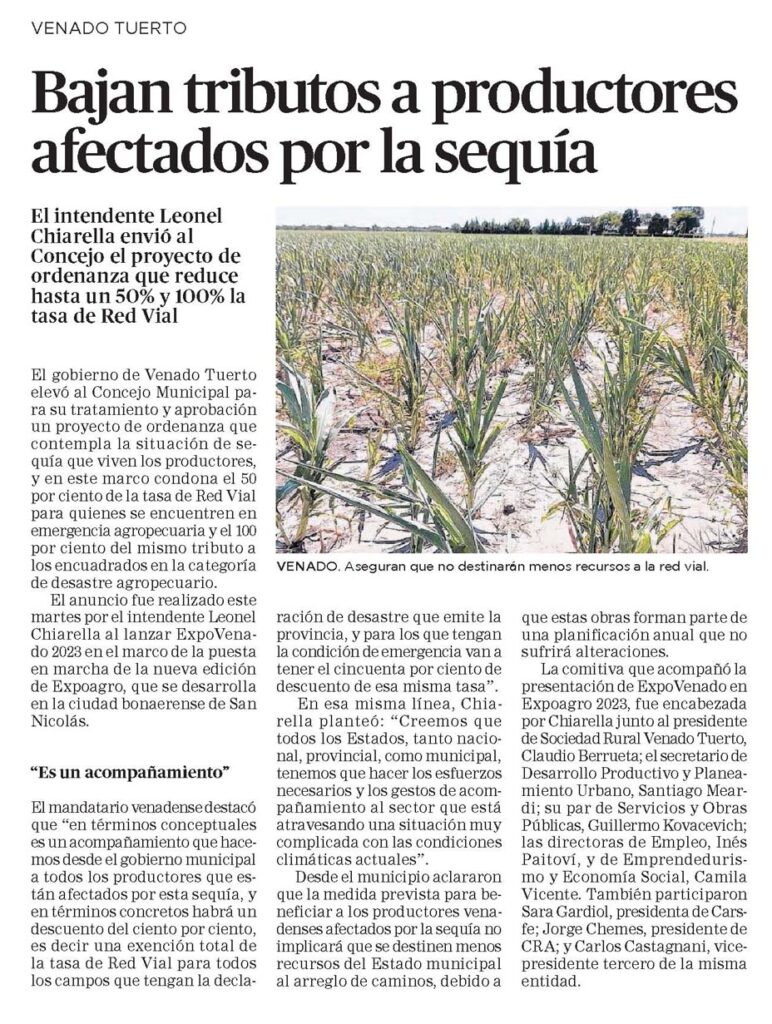 El mandatario venadense destacó que «en términos conceptuales es un acompañamiento que hacemos desde el gobierno municipal a todos los productores que están afectados por esta sequía, y en términos concretos habrá un descuento del ciento por ciento, es decir una exención total de la tasa de Red Vial para todos los campos que tengan la declaración de desastre que emite la provincia, y para los que tengan la condición de emergencia van a tener el cincuenta por ciento de descuento de esa misma tasa».