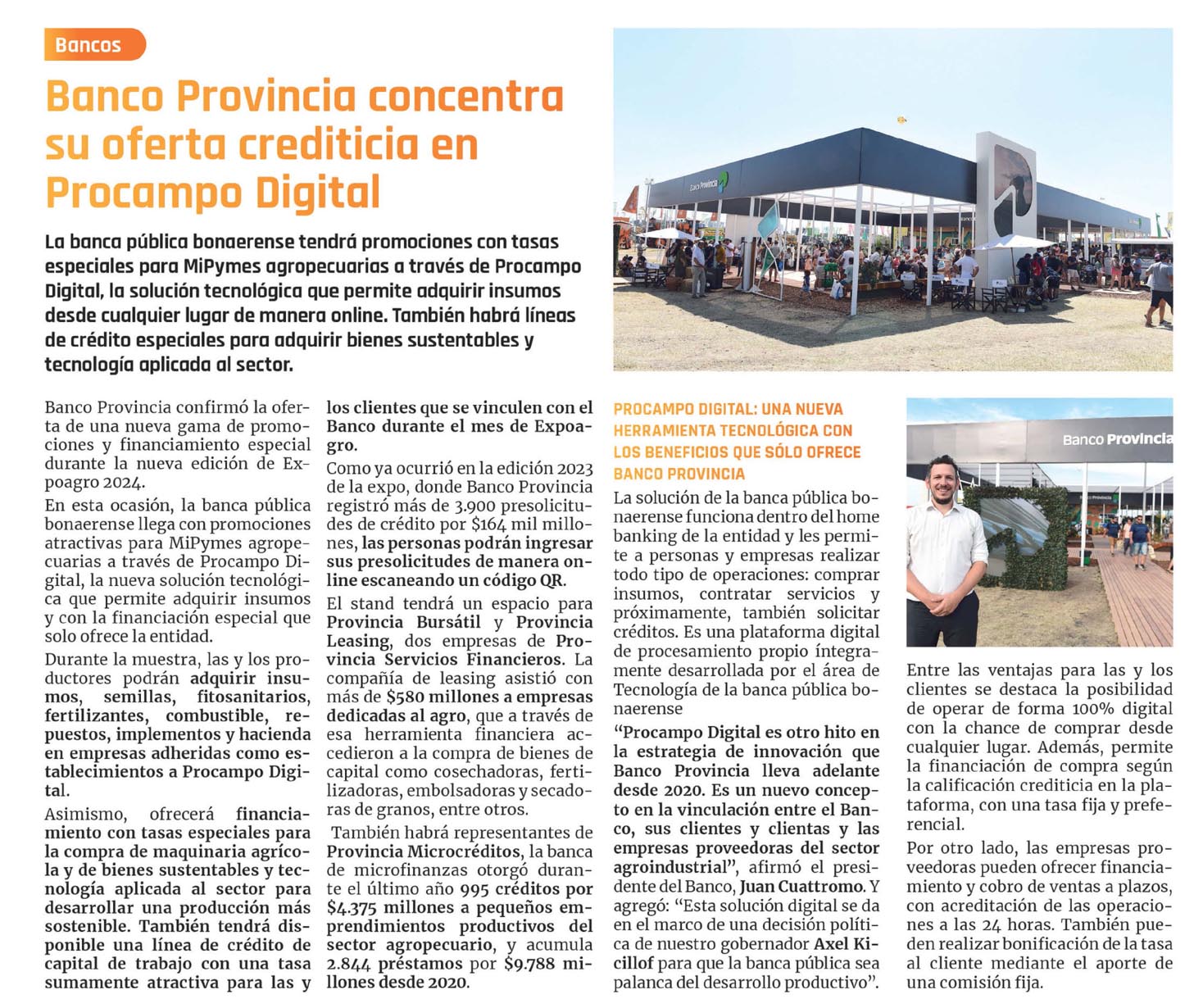 La banca pública bonaerense tendrá promociones con tasas especiales para MiPymes agropecuarias a través de Procampo Digital, la solución tecnológica que permite adquirir insumos desde cualquier lugar de manera online. También habrá líneas de crédito especiales para adquirir bienes sustentables y tecnología aplicada al sector.Banco Provincia confirmó la oferta de una nueva gama de promociones y financiamiento especial durante la nueva edición de Expoagro 2024.En esta ocasión, la banca pública bonaerense llega con promociones atractivas para MiPymes agropecuarias a través de Procampo Digital, la nueva solución tecnológica que permite adquirir insumos y con la financiación especial que solo ofrece la entidad.Durante la muestra, las y los productores podrán adquirir insumos, semillas, fitosanitarios, fertilizantes, combustible, repuestos, implementos y hacienda en empresas adheridas como establecimientos a Procampo Digital.Asimismo, ofrecerá financiamiento con tasas especiales para la compra de maquinaria agrícola y de bienes sustentables y tecnología aplicada al sector para desarrollar una producción más sostenible. También tendrá disponible una línea de crédito de capital de trabajo con una tasa sumamente atractiva para las y los clientes que se vinculen con el Banco durante el mes de Expoagro.Como ya ocurrió en la edición 2023 de la expo, donde Banco Provincia registró más de 3.900 presolicitudes de crédito por $164 mil millones, las personas podrán ingresar sus presolicitudes de manera online esca- neando un código QR.El stand tendrá un espacio para Provincia Bursátil y Provincia Leasing, dos empresas de Provincia Servicios Financieros. La compañía de leasing asistió con más de $580 millones a empresas dedicadas al agro, que a través de esa herramienta financiera accedieron a la compra de bienes de capital como cosechadoras, fertili- zadoras, embolsadoras y secadoras de granos, entre otros.También habrá representantes de Provincia Microcréditos, la banca de microfinanzas otorgó durante el último año 995 créditos por $4.375 millones a pequeños emprendimientos productivos del sector agropecuario, y acumula 2.844 préstamos por $9.788 millones desde 2020.PROCAMPO DIGITAL: UNA NUEVA HERRAMIENTA TECNOLÓGICA CON LOS BENEFICIOS QUE SÓLO OFRECE BANCO PROVINCIA La solución de la banca pública bonaerense funciona dentro del home banking de la entidad y les permite a personas y empresas realizar todo tipo de operaciones: comprar insumos, contratar servicios y próximamente, también solicitar créditos. Es una plataforma digital de procesamiento propio íntegramente desarrollada por el área de Tecnología de la banca pública bonaerense «Procampo Digital es otro hito en la estrategia de innovación que Banco Provincia lleva adelante desde 2020. Es un nuevo concepto en la vinculación entre el Banco, sus clientes y dientas y las empresas proveedoras del sector agroindustrial», afirmó el presidente del Banco, Juan Cuattro- mo. Y agregó: «Esta solución digital se da en el marco de una decisión política de nuestro gobernador Axel Kicillof para que la banca pública sea palanca del desarrollo productivo». Entre las ventajas para las y los clientes se destaca la posibilidad de operar de forma 100% digital con la chance de comprar desde cualquier lugar. Además, permite la financiación de compra según la calificación crediticia en la plataforma, con una tasa fija y preferencial.Por otro lado, las empresas proveedoras pueden ofrecer financiamiento y cobro de ventas a plazos, con acreditación de las operaciones a las 24 horas. También pueden realizar bonificación de la tasa al cliente mediante el aporte de una comisión fija.