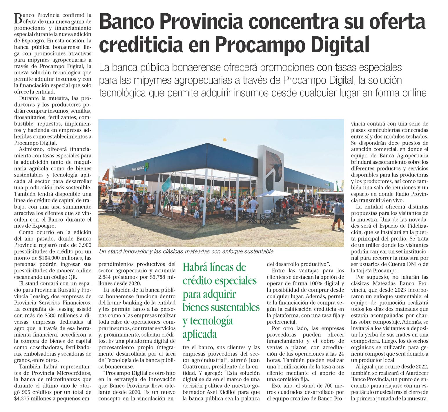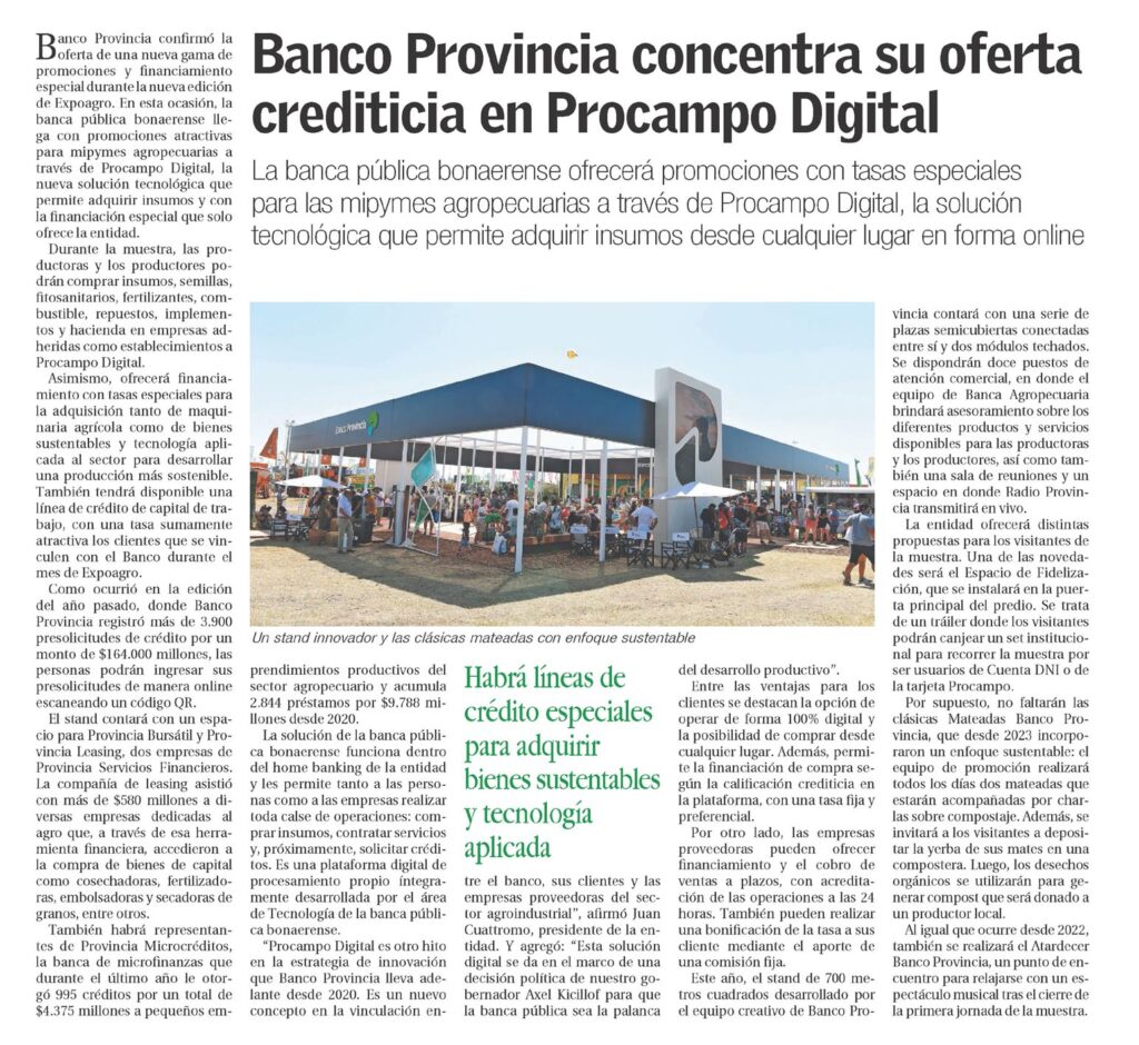 Banco Provincia confirmó la oferta de una nueva gama de promociones y financiamiento especial durante la nueva edición de Expoagro. En esta ocasión, la banca pública bonaerense llega con promociones atractivas para mipymes agropecuarias a través de Procampo Digital, la nueva solución tecnológica que permite adquirir insumos y con la financiación especial que solo ofrece la entidad.