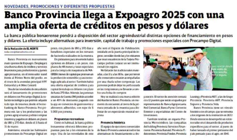 Banco Provincia llega a Expoagro 2025 con una amplia oferta de créditos en pesos y dólares.