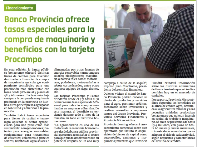 En esta edición, la banca pública bonaerense ofrecerá distintas líneas de créditos para Inversión destinadas a financiar la compra de maquinaria agrícola y/o equipamiento tecnológico para una producción más sustentable con tasas desde 38% anual y plazos de 48 y 60 meses. La tasa más baja será para la compra de maquinaria producida en la provincia de Buenos Aires por empresas agrupadas en MAGRIBA y adheridas a la promoción.