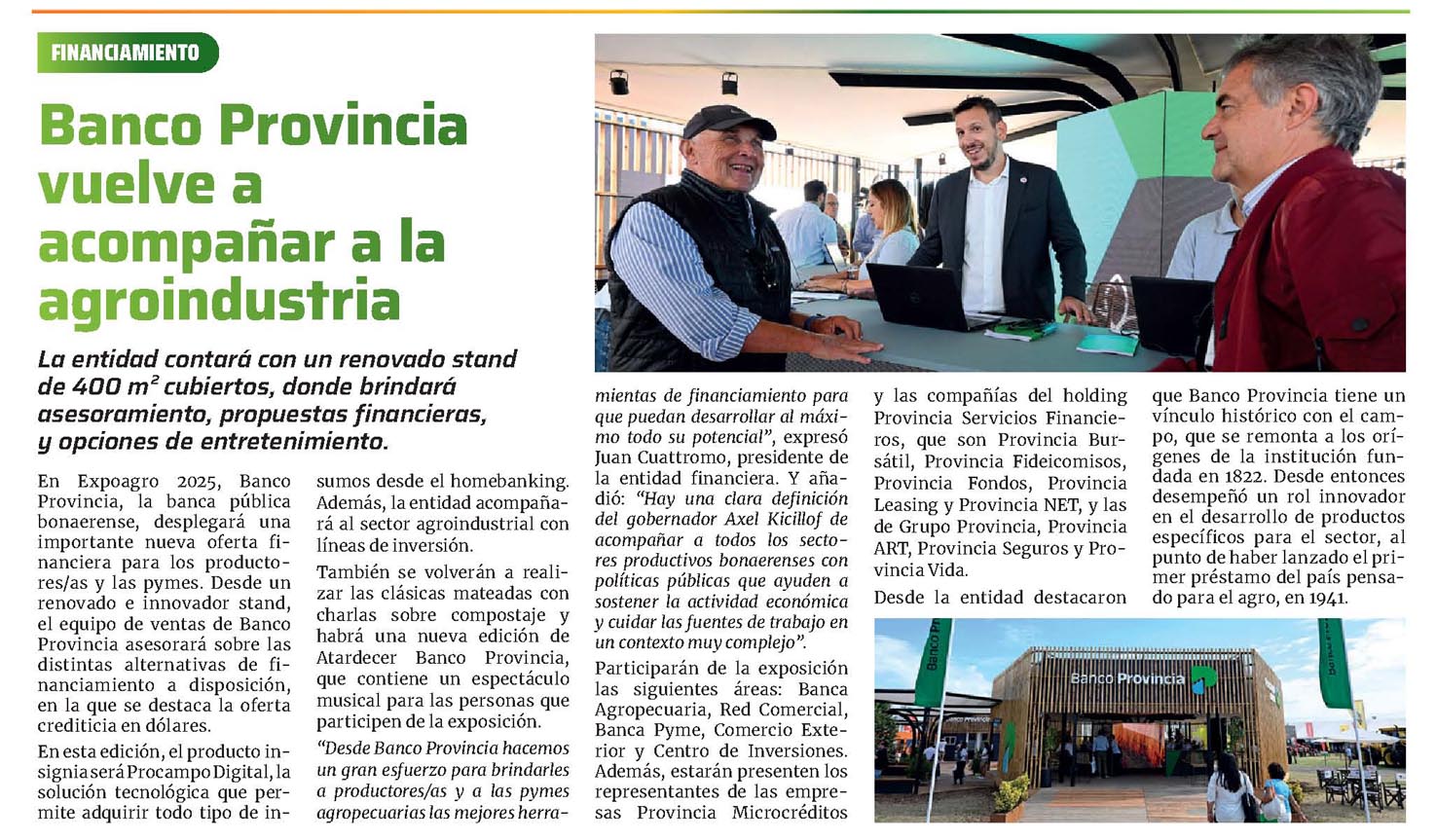 «Desde Banco Provincia hacemos un gran esfuerzo para brindarles a productores/as y a las pymes agropecuarias las mejores herra* mientas de fmandamiento para que puedan desarrollar al máximo todo su potencial», expresó Juan Cuattromo, presidente de la entidad financiera. Y añadió: «Hay una clara definición del gobernador Axel Kicillof de acompañar a todos los sectores productivos bonaerenses con políticas públicas que ayuden a sostener la actividad económica y cuidar lasfuentes de trabajo en un contexto muy complejo». Participarán de la exposición las siguientes áreas: Banca Agropecuaria, Red Comercial, Banca Pyme, Comercio Exterior y Centro de Inversiones. Además, estarán presenten los representantes de las empresas Provincia Microcréditos y las compañías del holding Provincia Servicios Financieros, que son Provincia Bursátil, Provincia Fideicomisos, Provincia Fondos, Provincia Leasing y Provincia NET, y las de Grupo Provincia, Provincia ART, Provincia Seguros y Provincia Vida.