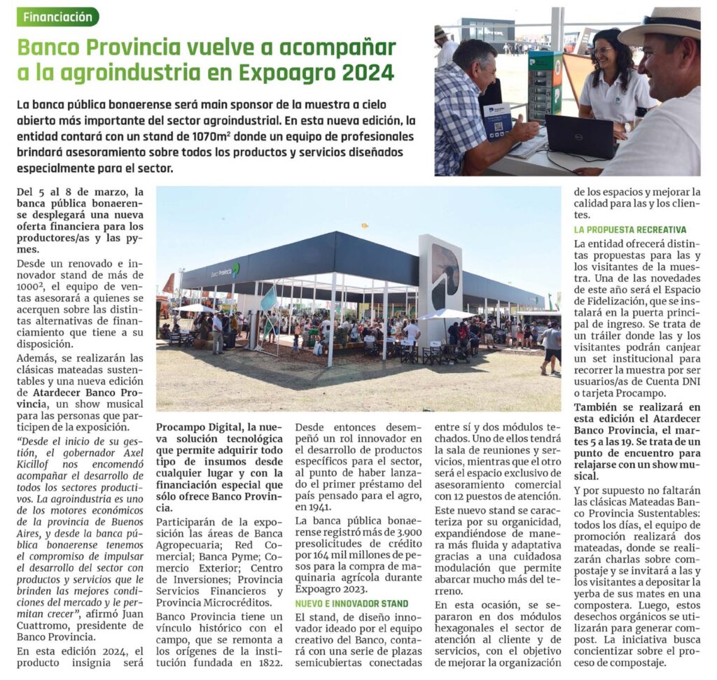 La banca pública bonaerense será main sponsor de la muestra a cielo abierto más importante del sector agroindustrial. En esta nueva edición, la entidad contará con un stand de 1070m2 donde un equipo de profesionales brindará asesoramiento sobre todos los productos y servicios diseñados especialmente para el sector.Del 5 al 8 de marzo, la banca pública bonaerense desplegará una nueva oferta financiera para los produc- tores/as y las pymes.Desde un renovado e innovador stand de más de 10002, el equipo de ventas asesorará a quienes se acerquen sobre las distintas alternativas de financiamiento que tiene a su disposición.Además, se realizarán las clásicas mateadas sustenta- bles y una nueva edición de Atardecer Banco Provincia, un show musical para las personas que participen de la exposición.»Desde el inicio de su gestión, el gobernador Axel Kicillof nos encomendó acompañar el desarrollo de todos los sectores productivos. La agroindustria es uno de los motores económicos de la provincia de Buenos Aires, y desde la banca pública bonaerense tenemos el compromiso de impulsar el desarrollo del sector con productos y servicios gue le brinden las mejores condiciones del mercado y le permitan crecer», afirmó Juan Cuattromo, presidente de Banco Provincia.En esta edición 2024, el producto insignia será Procampo Digital, la nueva solución tecnológica que permite adquirir todo tipo de insumos desde cualquier lugar y con la financiación especial que sólo ofrece Banco Provincia. Participarán de la exposición las áreas de Banca Agropecuaria; Red Comercial; Banca Pyme; Comercio Exterior; Centro de Inversiones; Provincia Servicios Financieros y Provincia Microcréditos. Banco Provincia tiene un vínculo histórico con el campo, que se remonta a los orígenes de la institución fundada en 1822. Desde entonces desempeñó un rol innovador en el desarrollo de productos específicos para el sector, al punto de haber lanzado el primer préstamo del país pensado para el agro, en 194.1. La banca pública bonaerense registró más de 3.900 presolicitudes de crédito por 164. mil millones de pesos para la compra de maquinaria agrícola durante Expoagro 2023.NUEVO E INNOVADOR STAND El stand, de diseño innovador ideado por el equipo creativo del Banco, contará con una serie de plazas semi- cubiertas conectadas entre sí y dos módulos techados. Uno de ellos tendrá la sala de reuniones y servicios, mientras que el otro será el espacio exclusivo de asesoramiento comercial con 12 puestos de atención.Este nuevo stand se caracteriza por su organicidad, expandiéndose de manera más fluida y adaptativa gracias a una cuidadosa modulación que permite abarcar mucho más del terreno.En esta ocasión, se separaron en dos módulos hexagonales el sector de atención al cliente y de servicios, con el objetivo de mejorar la organización de los espacios y mejorar la calidad para las y los clientes.LA PROPUESTA RECREATIVA La entidad ofrecerá distintas propuestas para las y los visitantes de la muestra. Una de las novedades de este año será el Espacio de Fideliza- ción, que se instalará en la puerta principal de ingreso. Se trata de un tráiler donde las y los visitantes podrán canjear un set institucional para recorrer la muestra por ser usuarios/as de Cuenta DNI o tarjeta Procampo. También se realizará en esta edición el Atardecer Banco Provincia, el martes 5 a las 19. Se trata de un punto de encuentro para relajarse con un show musical.Y por supuesto no faltarán las clásicas Mateadas Banco Provincia Sustentables: todos los días, el equipo de promoción realizará dos mateadas, donde se realizarán charlas sobre compostaje y se invitará a las y los visitantes a depositar la yerba de sus mates en una compos- tera. Luego, estos desechos orgánicos se utilizarán para generar compost. La iniciativa busca concientizar sobre el proceso de compostaje.