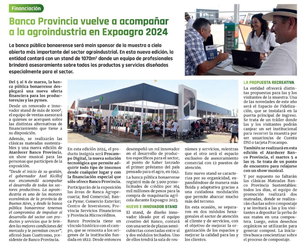 La banca pública bonaerense será main sponsor de la muestra a cielo abierto más importante del sector agroindustrial. En esta nueva edición, la entidad contará con un stand de 1070m2 donde un equipo de profesionales brindará asesoramiento sobre todos los productos y servicios diseñados especialmente para el sector.
