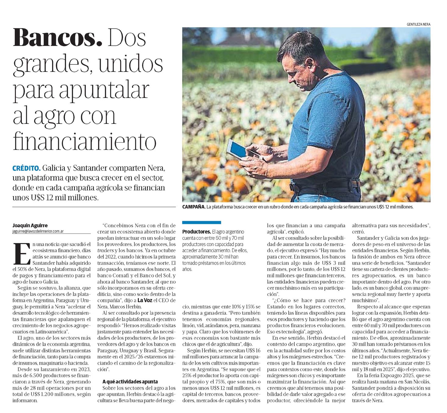 “Concebimos Nera con el fin de crear un ecosistema abierto donde puedan interactuar en un solo lugar los proveedores, los productores, los traders y los bancos. Ya en octubre del 2022, cuando hicimos la primera transacción, teníamos ese norte. El año pasado, sumamos dos bancos, el banco Comafi y el Banco del Sol, y ahora al banco Santander, al que no solo incorporamos en su oferta crediticia, sino como socio dentro de la compañía”, dijo a La Voz el CEO de Nera, Marcos Herbin.