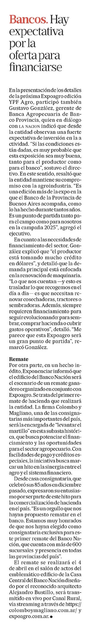 El remate se realizará el 4 de abril en el salón de actos del emblemático edificio de la Casa Central del Banco Nación diseñado por el reconocido arquitecto Alejandro Bustillo, será transmitido en vivo por Canal Rural, vía streaming a través de https:// colomboymagliano.com.ar/ y expoagro.com.ar.