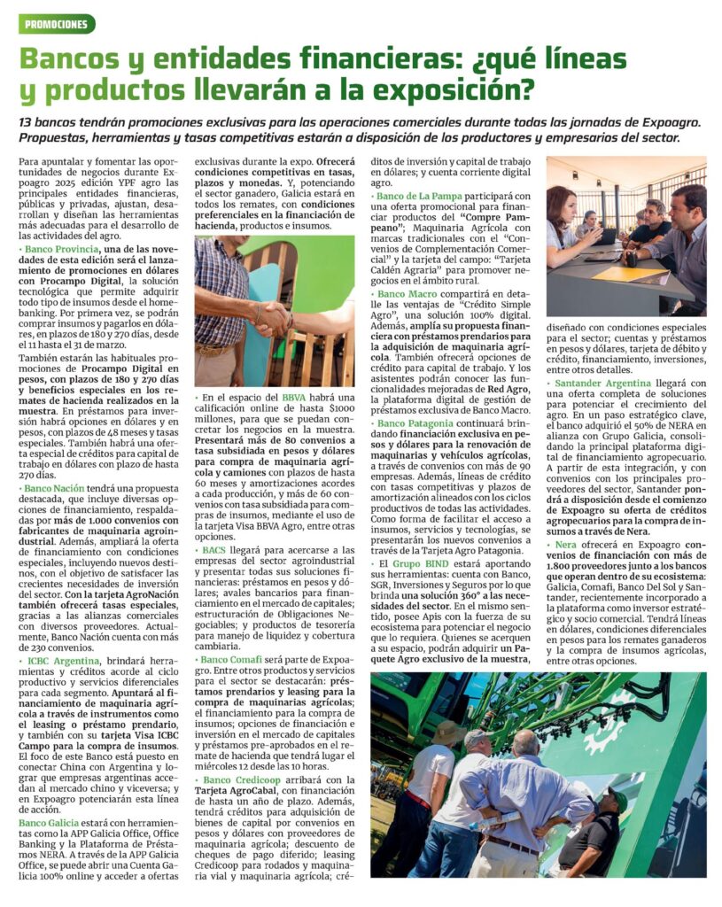 Para apuntalar y fomentar las oportunidades de negocios durante Expoagro 2025 edición YPF agro las principales entidades financieras, públicas y privadas, ajustan, desarrollan y diseñan las herramientas más adecuadas para el desarrollo de las actividades del agro.