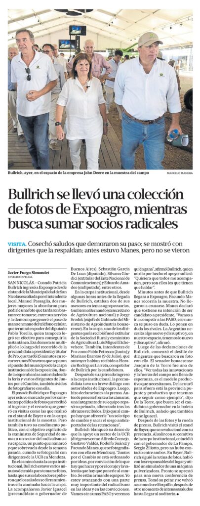 El paso de Bullrich por Expoagro ayer estuvo marcado por los constantes pedidos de fotos que recibió al ingresar y el revuelo que generó en visitas como las que realizó en el stand de Bayer o en la carpa institucional de la muestra. Pero también tuvo su condimento político, con el objetivo explícito de la exministra de Seguridad de sumar a un sector del radicalismo a su espacio, un punto que remarcó y que sobrevuela desde la semana pasada, cuando se fotografió con dirigentes de la UCR en Mendoza.