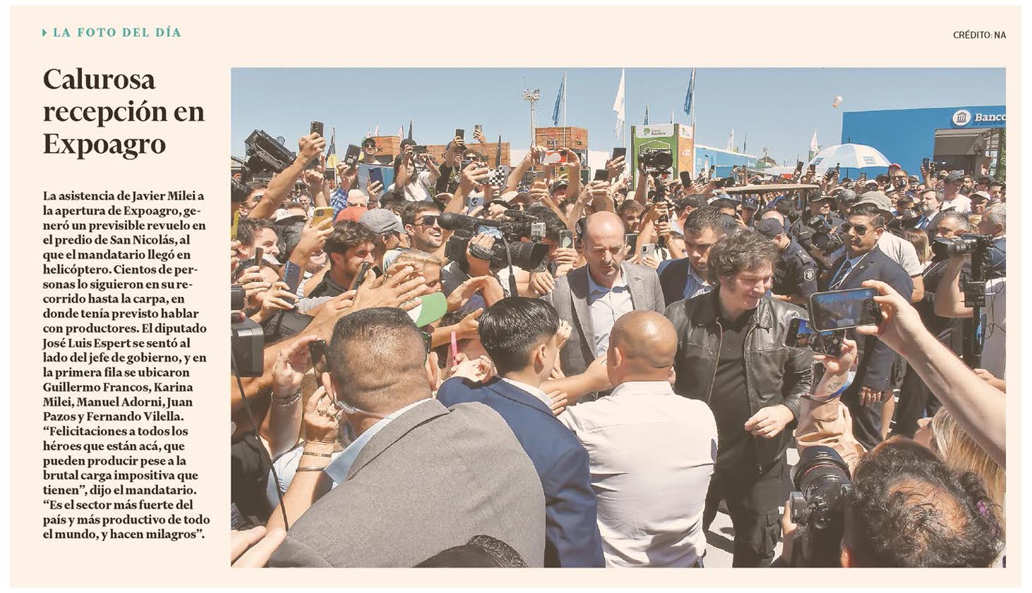 La asistencia de Javier Milei a la apertura de Expoagro, generó un previsible revuelo en el predio de San Nicolás, al que el mandatario llegó en helicóptero. Cientos de personas lo siguieron en su recorrido hasta la carpa, en donde tenía previsto hablar con productores. El diputado José Luis Espert se sentó al lado del jefe de gobierno, y en la primera fila se ubicaron Guillermo Francos, Karina Milei, Manuel Adorni, Juan Pazos y Fernando Vilella.