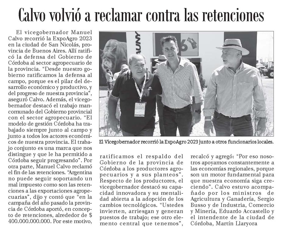 El vicegobernador Manuel Calvo recorrió la ExpoAgro 2023 en la ciudad de San Nicolás, provincia de Buenos Aires. Allí ratificó la defensa del Gobierno de Córdoba al sector agropecuario de la provincia. «Desde nuestro gobierno ratificamos la defensa al campo, porque es el pilar del desarrollo económico y productivo, y del progreso de nuestra provincia», aseguró Calvo. Además, el vicegobernador destacó el trabajo mancomunado del Gobierno provincial con el sector agropecuario. «El modelo de gestión Córdoba ha trabajado siempre junto al campo y junto a todos los actores económicos de nuestra provincia. El trabajo conjunto es una marca que nos distingue y que le ha permitido a Córdoba seguir progresando». Por otra parte, Manuel Calvo reclamó el fin de las retenciones. «Argentina no puede seguir soportando un mal impuesto como son las retenciones a las exportaciones agropecuarias», dijo y contó que «en la campaña del año pasado la provincia de Córdoba aportó, en concepto de retenciones, alrededor de $ 400.000.000.000. Por este motivo,