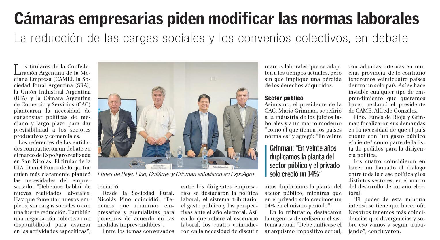 Los titulares de la Confederación Argentina de la Mediana Empresa (CAME), la Sociedad Rural Argentina (SRA), la Unión Industrial Argentina (UIA) y la Cámara Argentina de Comercio y Servicios (CAC) plantearon la necesidad de consensuar políticas de mediano y largo plazo para dar previsibilidad a los sectores productivos y comerciales. Los referentes de las entidades compartieron un debate en el marco de ExpoAgro realizada en San Nicolás. El titular de la UIA, Daniel Funes de Rioja, fue quien más claramente planteó las necesidades del empresariado. «Debemos hablar de nuevas realidades laborales. Hay que fomentar nuevos empleos, sin cargas sociales o con una fuerte reducción. También una negociación colectiva con disponibilidad para avanzar en las actividades específicas», remarcó. Desde la Sociedad Rural, Nicolás Pino coincidió: «Tenemos que reunirnos empresarios y gremialistas para ponernos de acuerdo en las medidas imprescindibles». Entre los temas conversados entre los dirigentes empresarios se destacaron la política laboral, el sistema tributario, el gasto público y las perspectivas ante el año electoral. Así, en lo que refiere al escenario laboral, los cuatro coincidieron en la necesidad de discutir marcos laborales que se adapten a los tiempos actuales, pero sin que implique una pérdida de los derechos adquiridos. Sector público Asimismo, el presidente de la CAC, Mario Grinman, se refirió a la industria de los juicios laborales y a un marco moderno «como el que tienen los países normales» y agregó: «En veinte años duplicamos la planta del sector público, mientras que en el privado solo crecimos un 14% en el mismo período». En lo tributario, destacaron la urgencia de rediseñar el sistema actual: «Debe unificase el anarquismo impositivo actual, con aduanas internas en muchas provincia, de lo contrario tendremos veinticuatro países dentro un solo país. Así se hace inviable cualquier tipo de emprendimiento que queramos hacer, reclamó el presidente de CAME, Alfredo González. Pino, Funes de Rioja y Grinman focalizaron sus demandas en la necesidad de que el país cuente con «un gasto público eficiente» como parte de la lista de pedidos para la dirigencia política. Los cuatro coincidieron en hacer un llamado al diálogo entre toda la clase política y los distintos sectores, en el marco del desarrollo de un año electoral. «El poder de esta minoría intensa se tiene que hacer oír. Nosotros tenemos más coincidencias que divergencias y sobre eso vamos a seguir trabajando», concluyeron.