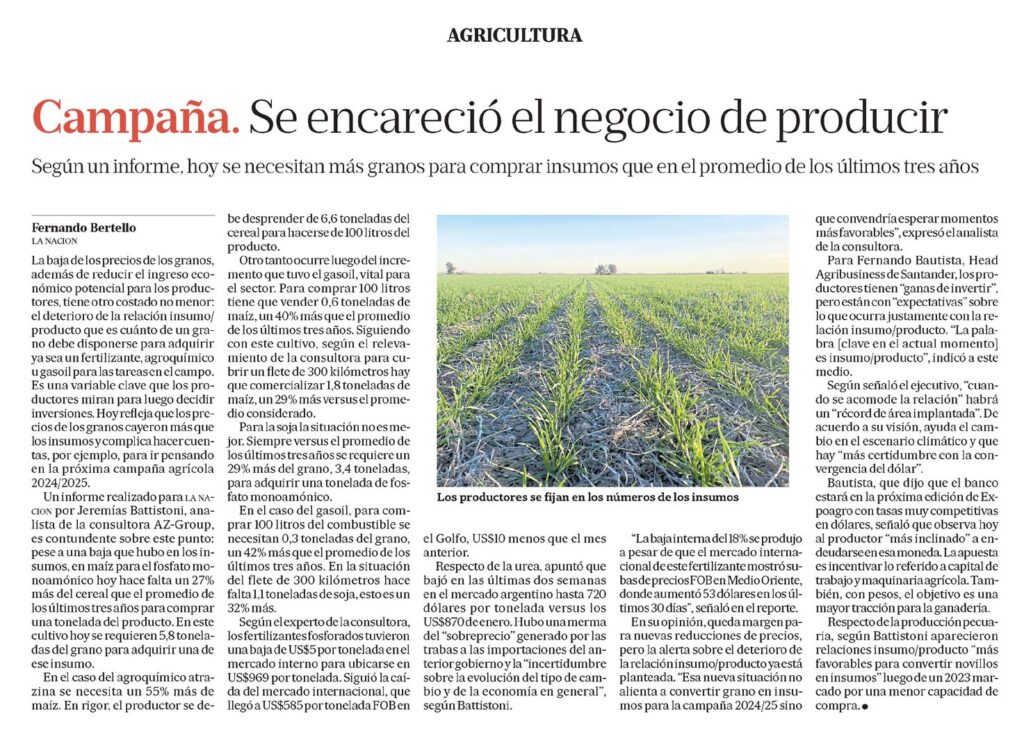 La baja de los precios de los granos, además de reducir el ingreso económico potencial para los productores, tiene otro costado no menor: el deterioro de la relación insumo/ producto que es cuánto de un grano debe disponerse para adquirir ya sea un fertilizante, agroquímico u gasoil para las tareas en el campo.Es una variable clave que los productores miran para luego decidir inversiones. Hoy refleja que los precios de los granos cayeron más que los insumos y complica hacer cuentas, por ejemplo, para ir pensando en la próxima campaña agrícola 2024/2025.Un informe realizado para la nacion por Jeremías Battistoni, analista de la consultora AZ-Group, es contundente sobre este punto: pese a una baja que hubo en los insumos, en maíz para el fosfato monoamónico hoy hace falta un 27% más del cereal que el promedio de los últimos tres años para comprar una tonelada del producto. En este cultivo hoy se requieren 5,8 toneladas del grano para adquirir una de ese insumo.En el caso del agroquímico atrazina se necesita un 55% más de maíz. En rigor, el productor se de be desprender de 6,6 toneladas del cereal para hacerse de 100 litros del producto.Otro tanto ocurre luego del incremento que tuvo el gasoil, vital para el sector. Para comprar 100 litros tiene que vender 0,6 toneladas de maíz, un 40% más que el promedio de los últimos tres años. Siguiendo con este cultivo, según el relevamiento de la consultora para cubrir un flete de 300 kilómetros hay que comercializar 1,8 toneladas de maíz, un 29% más versus el promedio considerado.Para la soja la situación no es mejor. Siempre versus el promedio de los últimos tres años se requiere un 29% más del grano, 3,4 toneladas, para adquirir una tonelada de fosfato monoamónico.En el caso del gasoil, para comprar 100 litros del combustible se necesitan 0,3 toneladas del grano, un 42% más que el promedio de los últimos tres años. En la situación del flete de 300 kilómetros hace falta 1,1 toneladas de soja, esto es un 32% más.Según el experto de la consultora, los fertilizantes fosforados tuvieron una baja de US$5 por tonelada en el mercado interno para ubicarse en US$969 por tonelada. Siguió la caída del mercado internacional, que llegó a US$585 por tonelada FOB en el Golfo, US$10 menos que el mes anterior.Respecto de la urea, apuntó que bajó en las últimas dos semanas en el mercado argentino hasta 720 dólares por tonelada versus los US$870 de enero. Hubo una merma del «sobreprecio» generado por las trabas a las importaciones del anterior gobierno y la «incertidumbre sobre la evolución del tipo de cambio y de la economía en general», según Battistoni.«La baja interna del 18% se produjo a pesar de que el mercado internacional de este fertilizante mostró subas de precios FOB en Medio Oriente, donde aumentó 53 dólares en los últimos 30 días», señaló en el reporte.En su opinión, queda margen para nuevas reducciones de precios, pero la alerta sobre el deterioro de la relación insumo/producto ya está planteada. «Esa nueva situación no alienta a convertir grano en insumos para la campaña 2024/25 sino que convendría esperar momentos más favorables», expresó el analista de la consultora.Para Fernando Bautista, Head Agribusiness de Santander, los productores tienen «ganas de invertir», pero están con «expectativas» sobre lo que ocurra justamente con la relación insumo/producto. «La palabra [clave en el actual momento] es insumo/producto», indicó a este medio.Según señaló el ejecutivo, «cuando se acomode la relación» habrá un «récord de área implantada». De acuerdo a su visión, ayuda el cambio en el escenario climático y que hay «más certidumbre con la convergencia del dólar».Bautista, que dijo que el banco estará en la próxima edición de Expoagro con tasas muy competitivas en dólares, señaló que observa hoy al productor «más inclinado» a endeudarse en esa moneda. La apuesta es incentivar lo referido a capital de trabajo y maquinaria agrícola. También, con pesos, el objetivo es una mayor tracción para la ganadería.Respecto de la producción pecuaria, según Battistoni aparecieron relaciones insumo/producto «más favorables para convertir novillos en insumos» luego de un 2023 marcado por una menor capacidad de compra.