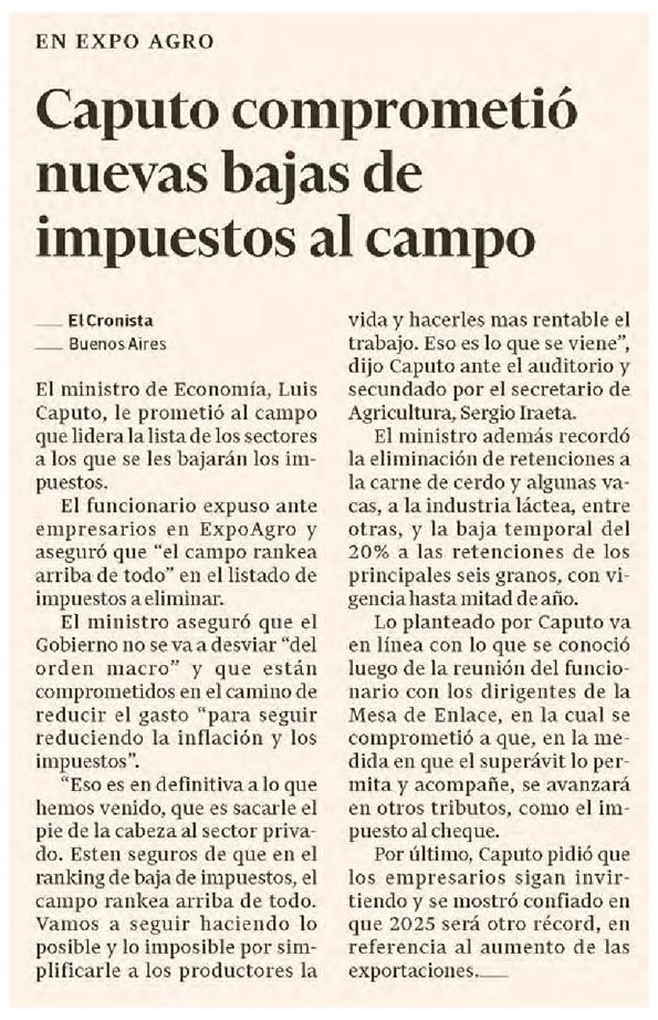Lo planteado por Caputo va en línea con lo que se conoció luego de la reunión del funcionario con los dirigentes de la Mesa de Enlace, en la cual se comprometió a que, en la medida en que el superávit lo permita y acompañe, se avanzará en otros tributos, como el impuesto al cheque.