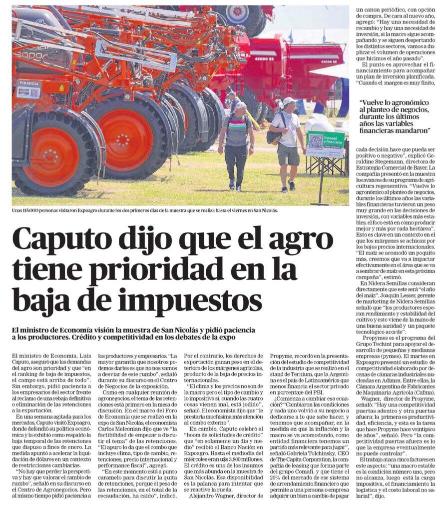 En cambio, Caputo celebró el “boom de solicitudes de crédito” que “en solamente un día y medio” recibió el Banco Nación en Expoagro. Hasta el mediodía del miércoles eran 3,800 millones de dólares. El crédito es uno de los insumos que más abunda en la muestra de San Nicolás. Esa disponibilidad es la palanca para intentar que se reactive la rueda.