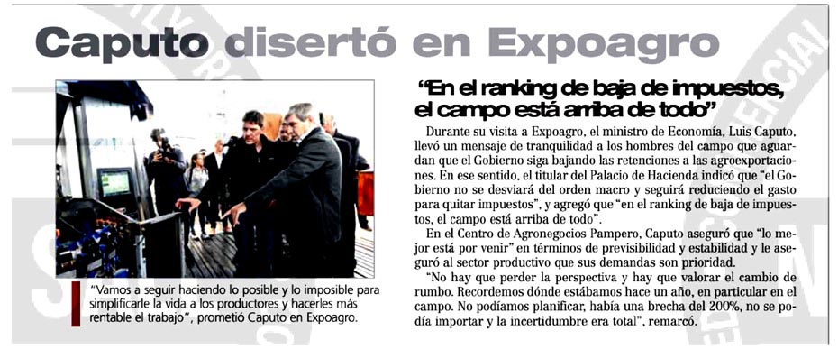 Durante su visita a Expoagro, el ministro de Economía, Luis Caputo, llevó un mensaje de tranquilidad a los hombres del campo que aguardan que el Gobierno siga bajando las retenciones a las agroexportaciones. En ese sentido, el titular de Hacienda indicó que “el Gobierno no se desviará del orden macro y seguirá reduciendo el gasto para quitar impuestos”, y agregó que “en el ranking de baja de impuestos, el campo está arriba de todo”.