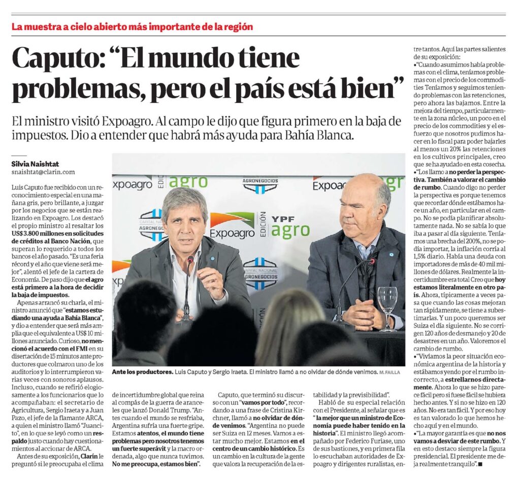Habló de su especial relación con el Presidente, al señalar que es » la mejor que un ministro de Economía puede haber tenido en la historia». El ministro llegó acompañado por Federico Furiase, uno de sus bastiones, y en primera fila lo escuchaban autoridades de Expoagro y dirigentes ruralistas, entre tantos. Aquí las partes salientes de su exposición: ?»Cuando asumimos había problemas con el clima, teníamos problemas con el precio de los commodities Teníamos y seguimos teniendo problemas con las retenciones, pero ahora las bajamos. Entre la mejora del tiempo, particularmente en la zona núcleo, un poco en el precio de los commodities y el esfuerzo que nosotros pudimos hacer en lo fiscal para poder bajarles al menos un 20% las retenciones en los cultivos principales, creo que se ha ayudado en esta cosecha.