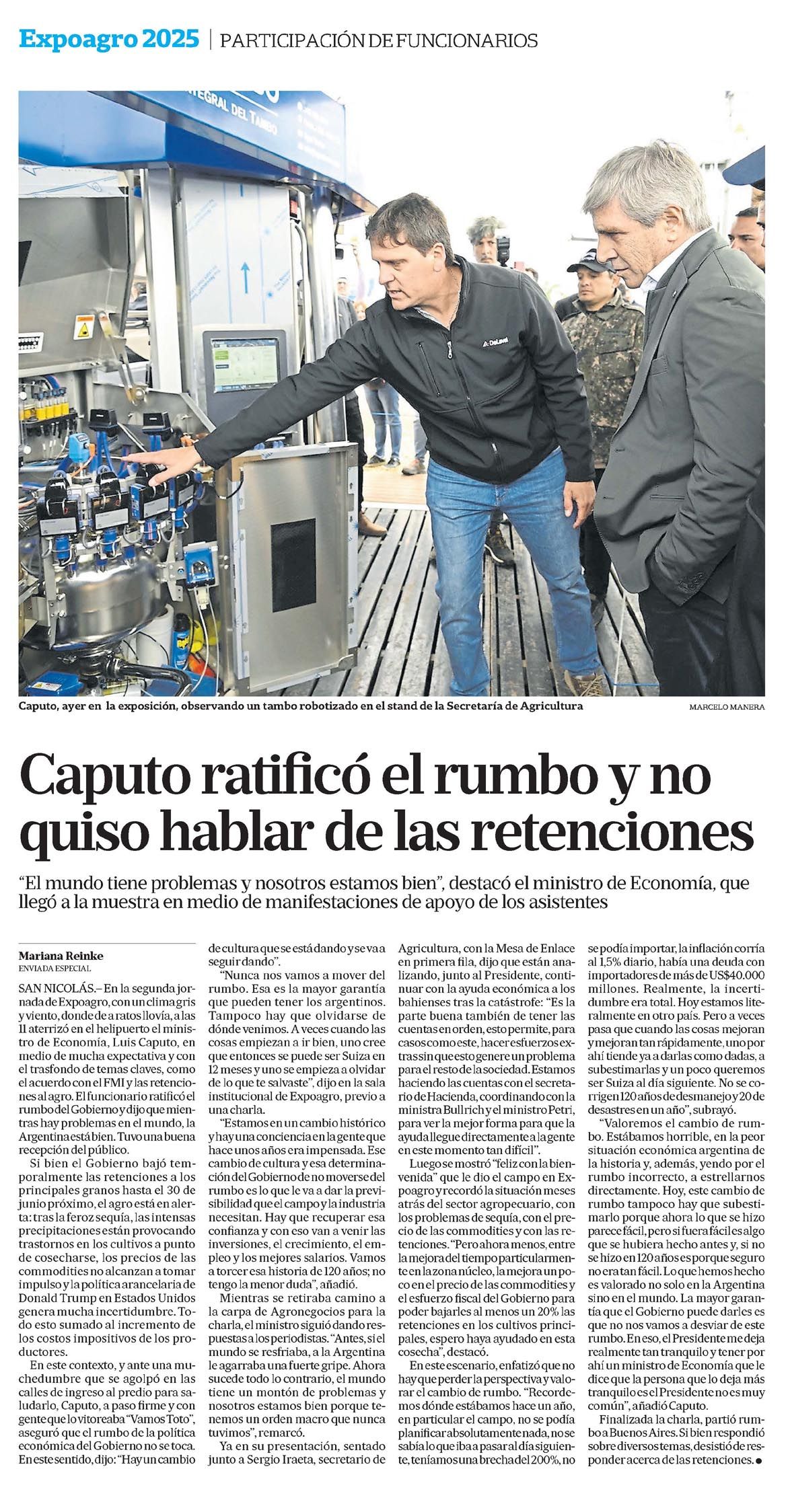 SAN NICOLÁS.? En la segunda jornada de Expoagro, con un clima gris y viento, donde de a ratos llovía, a las 11 aterrizó en el helipuerto el ministro de Economía, Luis Caputo, en medio de mucha expectativa y con el trasfondo de temas claves, como el acuerdo con el FMI y las retenciones al agro. El funcionario ratificó el rumbo del Gobierno y dijo que mientras hay problemas en el mundo, la Argentina está bien. Tuvo una buena recepción del público.