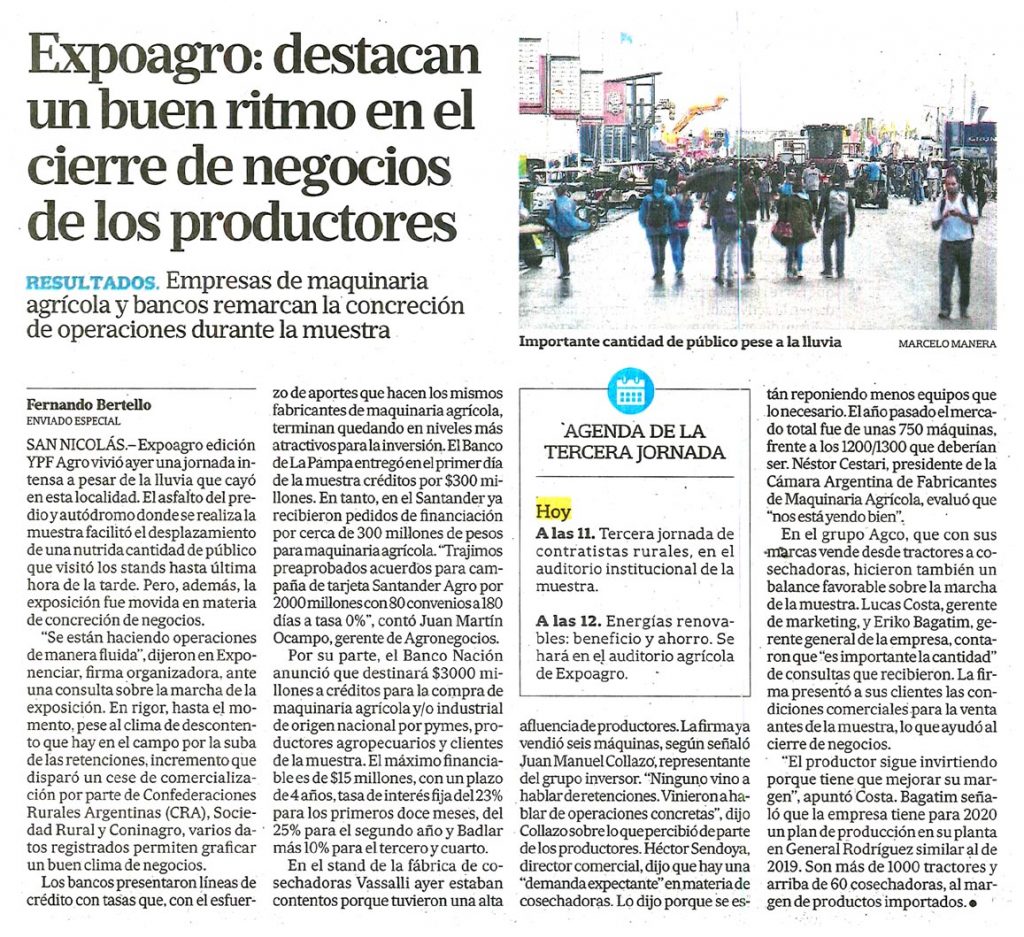 SAN NICOLÁS – Expoagro edición YPF Agro vivió ayer una j ornada intensa a pesar de la lluvia que cayó en esta localidad. El asfalto del predio y autódromo donde se realiza la muestra facilitó el desplazamiento de una nutrida cantidad de público que visitó los stands hasta última hora de la tarde. Pero, además, la exposición fue movida en materia de concreción de negocios.