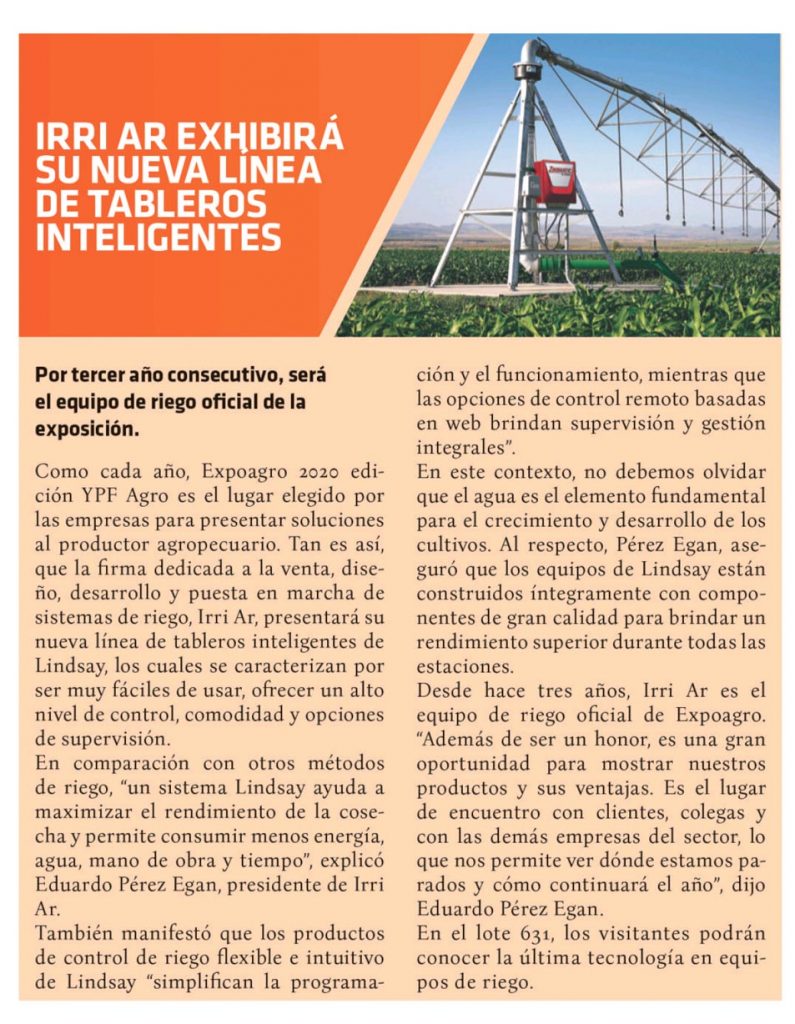 Como cada año, Expoagro 2020 edición YPF Agro es el lugar elegido por las empresas para presentar soluciones al productor agropecuario. Tan es así, que la firma dedicada a la venta, diseño, desarrollo y puesta en marcha de sistemas de riego, Irri Ar, presentará su nueva línea de tableros inteligentes de Lindsay, los cuales se caracterizan por ser muy fáciles de usar, ofrecer un alto nivel de control, comodidad y opciones de supervisión.