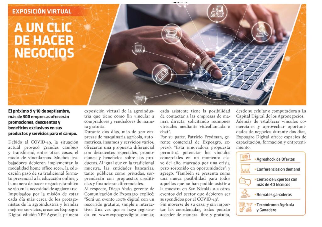Debido al COVID-19, la situación actual provocó grandes cambios y transformó, entre otras cosas, el modo de vincularnos. Muchos trabajadores debieron implementar la modalidad home office 100%, la educación pasó de su tradicional formato presencial a la educación online, y la manera de hacer negocios también se vio en la necesidad de aggiornarse. Impulsados por la misión de estar cada día más cerca de los protagonistas de la agroindustria y brindar mejores servicios, creamos Expoagro Digital edición YPF Agro: la primera exposición virtual de la agroindustria que tiene como fin vincular a compradores y vendedores de manera gratuita. Durante dos días, más de 300 empresas de maquinaria agrícola, automotrices, insumos y servicios varios, ofrecerán una propuesta diferencial con descuentos especiales, promociones y beneficios sobre sus productos. Al igual que en la tradicional muestra, las entidades bancarias, tanto públicas como privadas, sorprenderán con propuestas crediticias y financieras diferenciales. Al respecto, Diego Abdo, gerente de Comunicación de Expoagro, explicó: «Será un evento 100% digital con un recorrido gratuito, simple e interactivo. Una vez que se haya registrado en www.expoagrodigital.com.ar, cada asistente tiene la posibilidad de contactar a las empresas de manera directa, solicitando reuniones virtuales mediante videollamada o chat». Por su parte, Patricio Frydman, gerente comercial de Expoagro, expresó: «Esta innovadora propuesta permitirá potenciar los vínculos comerciales en un momento clave del año, marcado por una crisis, pero sostenido en oportunidades», y agregó: «También se presenta como una nueva posibilidad para todos aquellos que no han podido asistir a la muestra en San Nicolás o a otros eventos del sector que debieron ser suspendidos por el COVID-19». Sin moverse de su casa, y sin importar las coordenadas, todos podrán acceder de manera libre y gratuita, desde su celular o computadora a La Capital Digital de los Agronegocios. Además de establecer vínculos comerciales y aprovechar oportunidades de negocios durante dos días, Expoagro Digital ofrece espacios de capacitación, formación y entretenimiento.