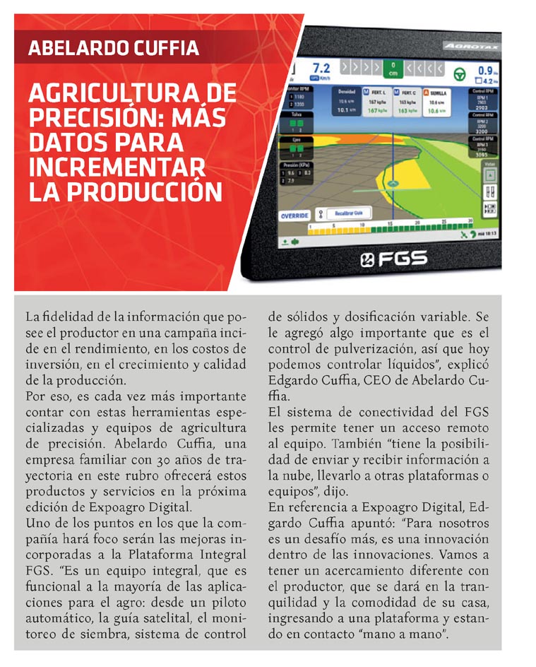 La fidelidad de la información que posee el productor en una campaña incide en el rendimiento, en los costos de inversión, en el crecimiento y calidad de la producción. Por eso, es cada vez más importante contar con estas herramientas especializadas y equipos de agricultura de precisión. Abelardo Cuffia, una empresa familiar con 30 años de trayectoria en este rubro ofrecerá estos productos y servicios en la próxima edición de Expoagro Digital. Uno de los puntos en los que la compañía hará foco serán las mejoras incorporadas a la Plataforma Integral FGS. «Es un equipo integral, que es funcional a la mayoría de las aplicaciones para el agro: desde un piloto automático, la guía satelital, el monitoreo de siembra, sistema de control de sólidos y dosificación variable. Se le agregó algo importante que es el control de pulverización, así que hoy podemos controlar líquidos”, explicó Edgardo Cuffia, CEO de Abelardo Cuffia. El sistema de conectividad del FGS les permite tener un acceso remoto al equipo. También «tiene la posibilidad de enviar y recibir información a la nube, llevarlo a otras plataformas o equipos”, dijo. En referencia a Expoagro Digital, Edgardo Cuffia apuntó: «Para nosotros es un desafío más, es una innovación dentro de las innovaciones. Vamos a tener un acercamiento diferente con el productor, que se dará en la tranquilidad y la comodidad de su casa, ingresando a una plataforma y estando en contacto «mano a mano”.