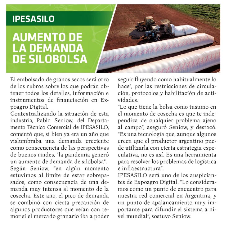 El embolsado de granos secos será otro de los rubros sobre los que podrán obtener todos los detalles, información e instrumentos de financiación en Expoagro Digital. Contextualizando la situación de esta industria, Pablo Seniow, del Departamento Técnico Comercial de IPESASILO, comentó que, si bien ya era un año que vislumbraba una demanda creciente como consecuencia de las perspectivas de buenos rindes, “la pandemia generó un aumento de demanda de silobolsa”. Según Seniow, “en algún momento estuvimos al límite de estar sobrepasados, como consecuencia de una demanda muy intensa al momento de la cosecha. Este año, el pico de demanda se combinó con cierta precaución de algunos productores que veían con temor si el mercado granario iba a poder seguir fluyendo como habitualmente lo hace”, por las restricciones de circulación, protocolos y habilitación de actividades. “Lo que tiene la bolsa como insumo en el momento de cosecha es que te independiza de cualquier problema ajeno al campo”, aseguró Seniow, y destacó: “Es una tecnología que, aunque algunos creen que el productor argentino puede utilizarla con cierta estrategia especulativa, no es así. Es una herramienta para resolver los problemas de logística e infraestructura”. IPESASILO será uno de los auspiciantes de Expoagro Digital. “Lo consideramos como un punto de encuentro para nuestra red comercial en Argentina, y un punto de apalancamiento muy importante para difundir el sistema a nivel mundial”, sostuvo Seniow.