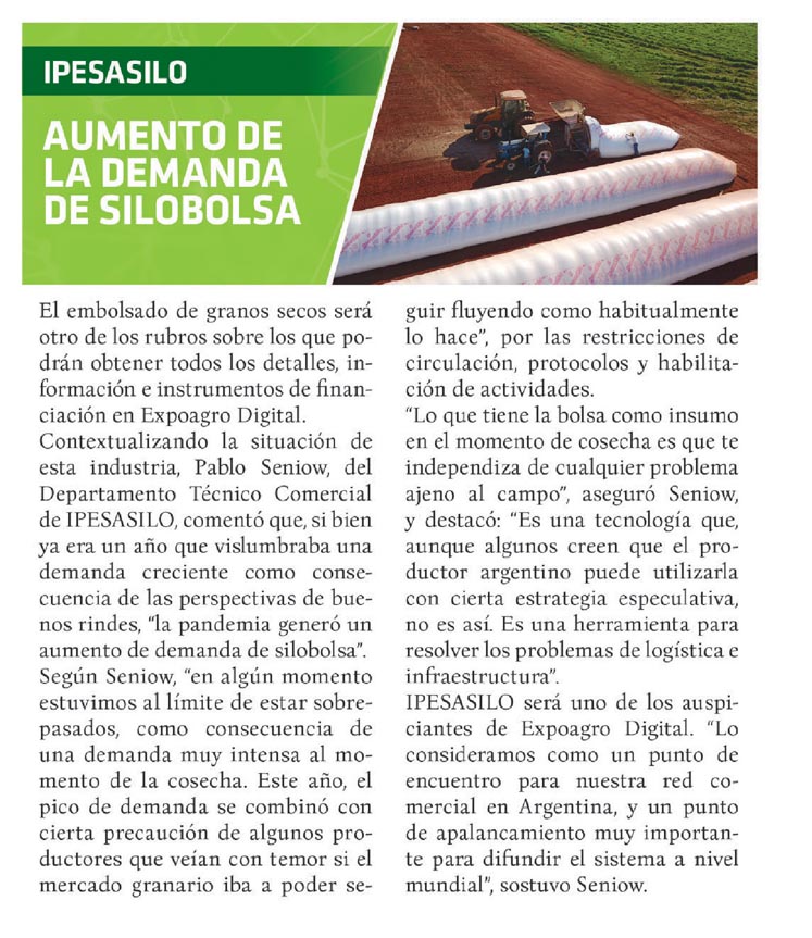 El embolsado de granos secos será otro de los rubros sobre los que podrán obtener todos los detalles, información e instrumentos de financiación en Expoagro Digital. Contextualizando la situación de esta industria, Pablo Seniow, del Departamento Técnico Comercial de IPESASILO, comentó que, si bien ya era un año que vislumbraba una demanda creciente como consecuencia de las perspectivas de buenos rindes, ‘la pandemia generó un aumento de demanda de silobolsa». Según Seniow, «en algún momento estuvimos al límite de estar sobrepasados, como consecuencia de una demanda muy intensa al momento de la cosecha. Este año, el pico de demanda se combinó con cierta precaución de algunos productores que veían con temor si el mercado granario iba a poder seguir fluyendo como habitualmente lo hace», por las restricciones de circulación, protocolos y habilitación de actividades. «Lo que tiene la bolsa como insumo en el momento de cosecha es que te independiza de cualquier problema ajeno al campo», aseguró Seniow, y destacó: «Es una tecnología que, aunque algunos creen que el productor argentino puede utilizarla con cierta estrategia especulativa, no es así. Es una herramienta para resolver los problemas de logística e infraestructura». IPESASILO será uno de los auspiciantes de Expoagro Digital. «Lo consideramos como un punto de encuentro para nuestra red comercial en Argentina, y un punto de apalancamiento muy importante para difundir el sistema a nivel mundial», sostuvo Seniow.