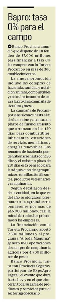 La financiación con la Tarjeta Procampo aportó 9.500 millones y el programa “A toda Máquina” generó 850 operaciones de compra de maquinaria agrícola por 4.900 millones de pesos Banco Provincia, junto con Provincia Seguros, participan de ExpoAgro Digital, el evento que dura hasta hoy y en el que ofrecerán toda su gama de productos y servicios para el sector agropecuario.