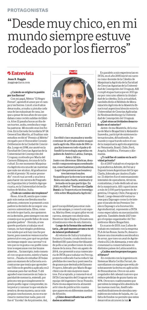 PERFIL Hernán Ferrari Escribió cinco manuales y medio centenar de artículos sobre maquinaria agrícola. Hizo más de 300 capacitaciones en todo el país y difundió la tecnología argentina en países de América Latina, Europa, Asia y Africa. Junto con divrersas fábricas, desarrolló componentes para sembradoras, cosechadoras y pulverizadoras. Logró dos patentes nacionales y tres internacionales. Su pasión por la docencia se manifiesta en cada charla, seminario y jornada en la que participa. En 2019, recibió el “Testimonio Clarín Rural a la Trayectoria en Investigación sobre Maquinaria Agrícola”.