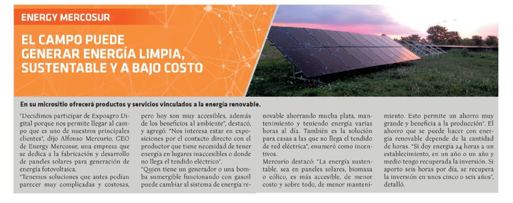 “Decidimos participar de Expoagro Digital porque nos permite llegar al campo que es uno de nuestros principales clientes”, dijo Alfonso Mercurio, CEO de Energy Mercosur, una empresa que se dedica a la fabricación y desarrollo de paneles solares para generación de energía fotovoltaica. “Tenemos soluciones que antes podían parecer muy complicadas y costosas, pero hoy son muy accesibles, además de los beneficios al ambiente”, destacó, y agregó: “Nos interesa estar en exposiciones por el contacto directo con el productor que tiene necesidad de tener energía en lugares inaccesibles o donde no llega el tendido eléctrico”. “Quien tiene un generador o una bomba sumergible funcionando con gasoil puede cambiar al sistema de energía renovable ahorrando mucha plata, mantenimiento y teniendo energía varias horas al día. También es la solución para casas a las que no llega el tendido de red eléctrica”, enumeró como incentivos. Mercurio destacó: “La energía sustentable, sea en paneles solares, biomasa o eólico, es más accesible, de menor costo y sobre todo, de menor mantenimiento. Esto permite un ahorro muy grande y beneficia a la producción”. El ahorro que se puede hacer con energía renovable depende de la cantidad de horas. “Si doy energía 24 horas a un establecimiento, en un año o un año y medio tengo recuperada la inversión. Si aporto seis horas por día, se recupera la inversión en unos cinco o seis años”, detalló.