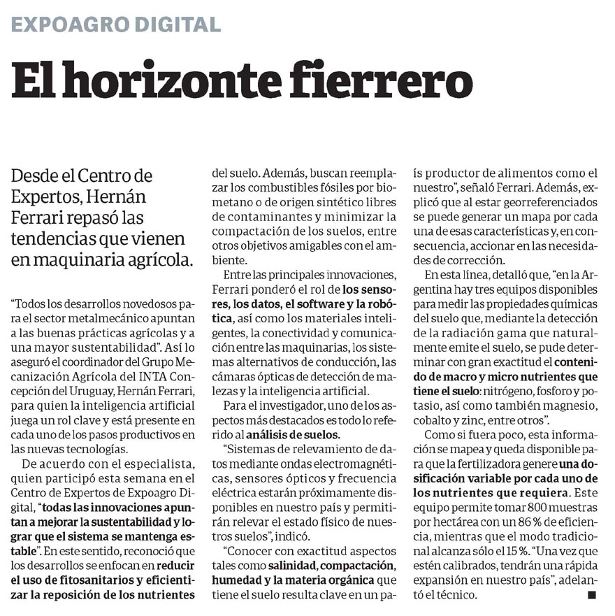 “Todos los desarrollos novedosos para el sector metalmecánico apuntan a las buenas prácticas agrícolas y a una mayor sustentabilidad”. Así lo aseguró el coordinador del Grupo Mecanización Agrícola del INTA Concepción del Uruguay, Hernán Ferrari, para quien la inteligencia artificial juega un rol clave y está presente en cada uno de los pasos productivos en las nuevas tecnologías.
