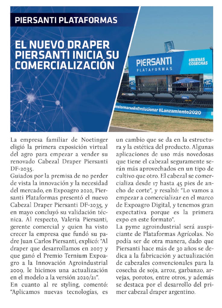 La empresa familiar de Noetinger eligió la primera exposición virtual del agro para empezar a vender su renovado Cabezal Draper Piersanti DF-2035. Guiados por la premisa de no perder de vista la innovación y la necesidad del mercado, en Expoagro 2020, Piersanti Plataformas presentó el nuevo Cabezal Draper Piersanti DF-2035, y en mayo concluyó su validación técnica. Al respecto, Valeria Piersanti, gerente comercial y quien ha visto crecer la empresa que fundó su padre Juan Carlos Piersanti, explicó: «Al draper que desarrollamos en 2007 y que ganó el Premio Ternium Expoagro a la Innovación Agroindustrial 2009, le hicimos una actualización en el modelo a la versión 2020/21″. En cuanto al re styling, comentó: «Aplicamos nuevas tecnologías, es un cambio que se da en la estructura y la estética del producto. Algunas aplicaciones de uso más novedosas que tiene el cabezal seguramente serán más aprovechados en un tipo de cultivo que otro. El cabezal se comercializa desde 17 hasta 45 pies de ancho de corte», y resaltó: «Lo vamos a empezar a comercializar en el marco de Expoagro Digital, y tenemos gran expectativa porque es la primera expo en este formato». La pyme agroindustrial será auspiciante de Plataformas Agrícolas. No podía ser de otra manera, dado que Piersanti hace más de 30 años se dedica a la fabricación y actualización de cabezales convencionales para la cosecha de soja, arroz, garbanzo, arvejas, porotos, entre otros, y además se destaca por el desarrollo del primer cabezal draper argentino.