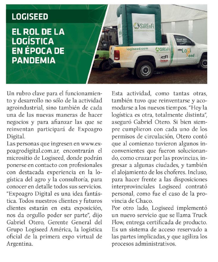 Un rubro clave para el funcionamiento y desarrollo no sólo de la actividad agroindustrial, sino también de cada una de las nuevas maneras de hacer negocios y para afianzar las que se reinventan participará de Expoagro Digital. Las personas que ingresen en www.expoagrodigital.com.ar, encontrarán el micrositio de Logiseed, donde podrán ponerse en contacto con profesionales con destacada experiencia en la logística del agro y la consultoría, para conocer en detalle todos sus servicios. «Expoagro Digital es una idea fantástica. Todos nuestros clientes y futuros clientes estarán en esta exposición, nos da orgullo poder ser parte», dijo Gabriel Otero, Gerente General del Grupo Logiseed América, la logística oficial de la primera expo virtual de Argentina. Esta actividad, como tantas otras, también tuvo que reinventarse y acomodarse a los nuevos tiempos. «Hoy la logística es otra, totalmente distinta», aseguró Gabriel Otero. Si bien siempre cumplieron con cada uno de los permisos de circulación, Otero contó que al comienzo tuvieron algunos inconvenientes que frieron solucionando, como cruzar por las provincias, ingresar a algunas ciudades, y también el alojamiento de los choferes. Incluso, para hacer frente a las disposiciones interprovinciales Logiseed contrató personal, como fue el caso de la provincia de Chaco. Por otro lado, Logiseed implemento un nuevo servicio que se llama Truck Flow, entrega certificada de producto. Es un sistema de acceso reservado a las partes implicadas, y que agiliza los procesos administrativos.