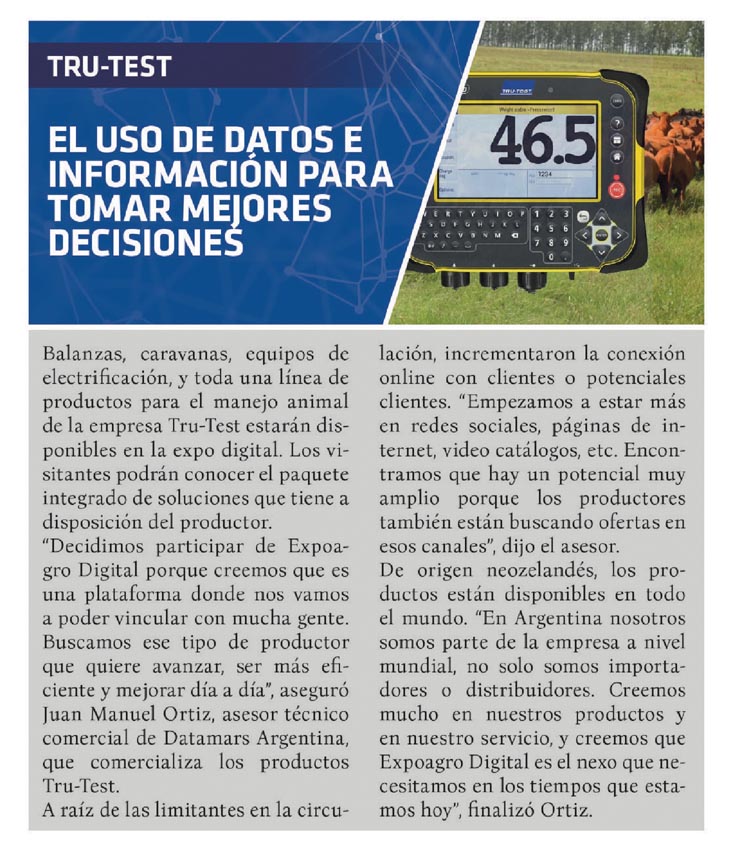 Balanzas, caravanas, equipos de electrificación, y toda una línea de productos para el manejo animal de la empresa Tru-Test estarán disponibles en la expo digital. Los visitantes podrán conocer el paquete integrado de soluciones que tiene a disposición del productor. «Decidimos participar de Expoagro Digital porque creemos que es una plataforma donde nos vamos a poder vincular con mucha gente. Buscamos ese tipo de productor que quiere avanzar, ser más eficiente y mejorar día a día», aseguró Juan Manuel Ortiz, asesor técnico comercial de Datamars Argentina, que comercializa los productos Tru-Test. A raíz de las limitantes en la circulación, incrementaron la conexión online con clientes o potenciales clientes. «Empezamos a estar más en redes sociales, páginas de internet, video catálogos, etc. Encontramos que hay un potencial muy amplio porque los productores también están buscando ofertas en esos canales», dijo el asesor. De origen neozelandés, los productos están disponibles en todo el mundo. «En Argentina nosotros somos parte de la empresa a nivel mundial, no solo somos importadores o distribuidores. Creemos mucho en nuestros productos y en nuestro servicio, y creemos que Expoagro Digital es el nexo que necesitamos en los tiempos que estamos hoy», finalizó Ortiz.
