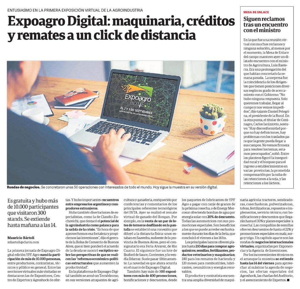 La primera jornada de Expoagro Digital edición YPF Agro sumó la participación de más de 10.000 personas, entre productores, contratistas, técnicos y público en general. Entre las secciones virtuales más visitadas se destacaron las de Expositores, Centro de Expertos y Agroshock de ofer- tas. Y hubo importantes encuentros entre empresarios argentinos y compradores extranjeros.
