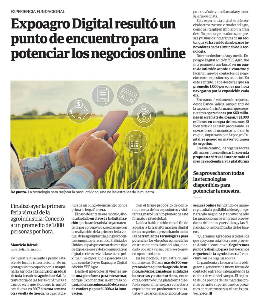 Con el firme propósito de continuar cerca de los expositores y visitantes, marcó un hito pionero de este formato a nivel global. La idea había nacido con el fin de apostar a la transformación digital de los negocios, aprovechando todas las herramientas tecnológicas para potenciar los vínculos comerciales en un momento clave del año, marcado por una crisis, pero sostenido en oportunidades. En los hechos, la muestra reunió durante casi 3 días a más de 300 empresas de maquinaria agrícola, insumos, servicios, ganaderas, entidades bancarias y automotrices, entre otras, dentro de una plataforma diseñada especialmente para conectar a expositores con productores, contratistas y usuarios relacionados al campo a través de videollamadas y mensajería de chats. Esta experiencia digital se diferenció de otros eventos virtuales del agro, como así también implicó un gran desafío para organizadores, empresas y usuarios integrantes de un sector que ya ha venido dando pasos innovadores hacia el mundo de la tecnología. Durante dos jornadas y media, Expoagro Digital edición YPF Agro, fue una propuesta que buscó ser un punto de inflexión acorde al contexto y facilitar nuevos contactos de negocios entre expositores y usuarios. En este sentido, cabe destacar que en promedio 1.000 personas por hora navegaron por la exposición cada día. En cuanto al volumen de negocios, desde Banco Galicia, auspiciante de la exposición, informaron que se generaron operaciones por $60 millones en el remate de Rosgan, y $1.000 millones en compra de insumos. Si bien todavía se están procesando las operaciones de maquinaria, lo cierto es que, impulsado por Expoagro Digital, se generó un mayor volumen de negocios. En este camino, los organizadores afirmaron que continuarán con esta propuesta virtual durante todo el mes de septiembre, y la plataforma seguirá online brindando de manera gratuita la posibilidad de seguir generando negocios y aprovechando las promociones de empresas proveedoras de bienes y servicios, y las financiaciones bonificadas de los bancos. “Queremos agradecer a todos los que apoyaron esta idea y este proyecto desde el comienzo. Seguiremos juntos trabajando para fortalecer los negocios de la agroindustria”, concluyeron los organizadores. La pandemia y la cuarentena obligaron a generar una nueva forma de contacto entre los integrantes de la cadena de valor del campo. El repunte de los precios de las materias primas permite suponer que los próximos encuentros serán aún más provechosos.